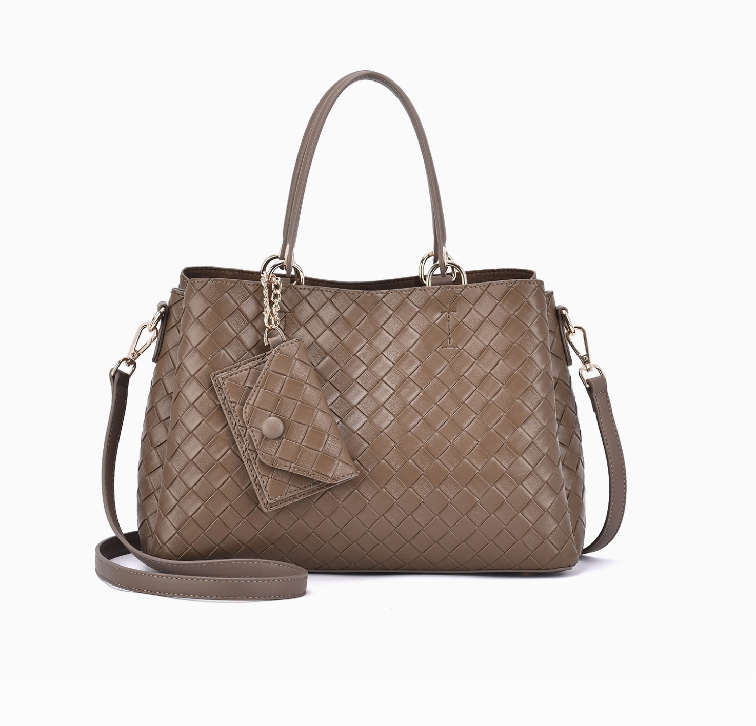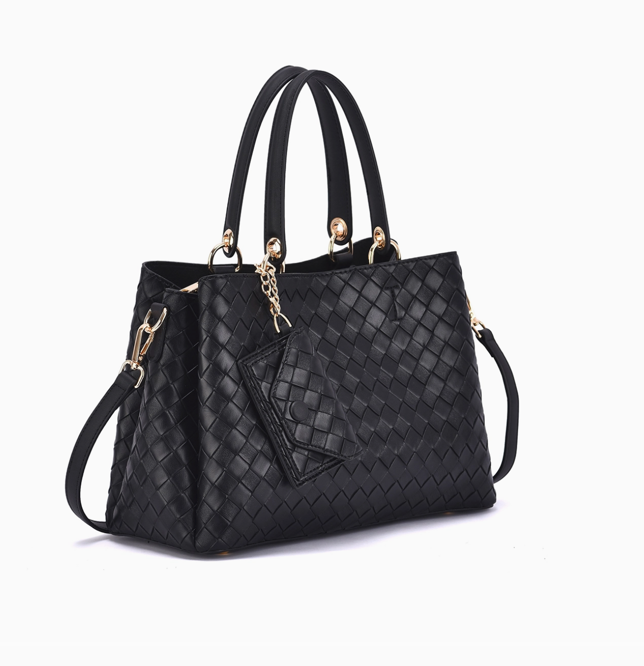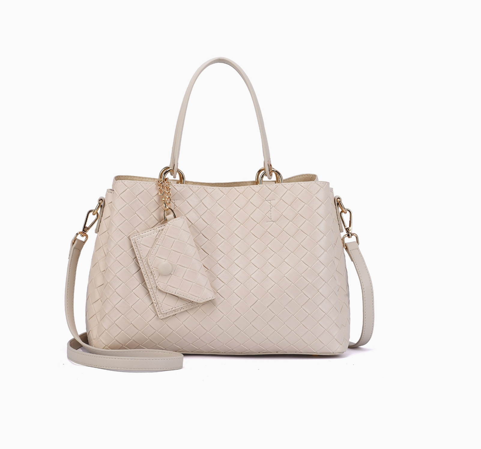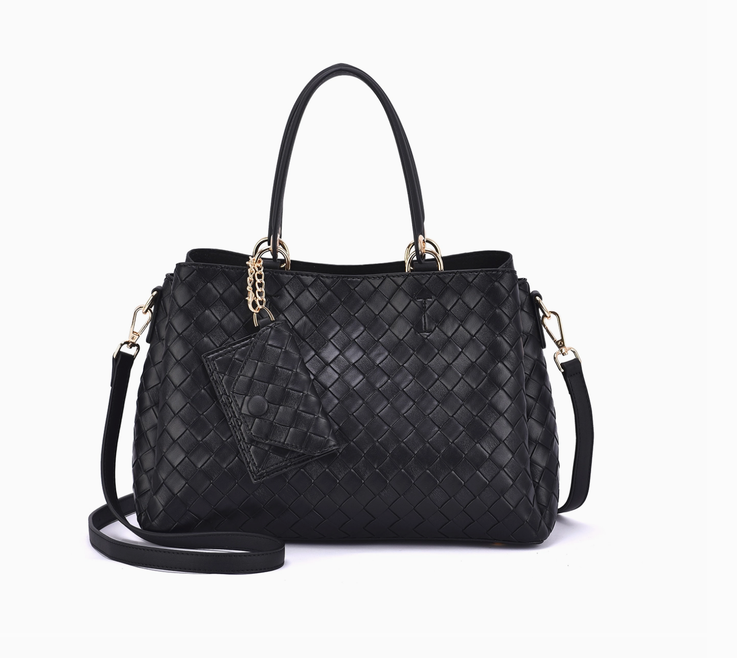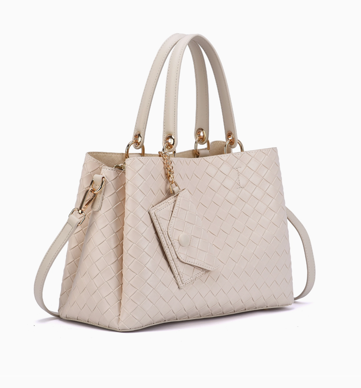 Woven embossed 3 compartment satchel with tassel decor and coin pouch.