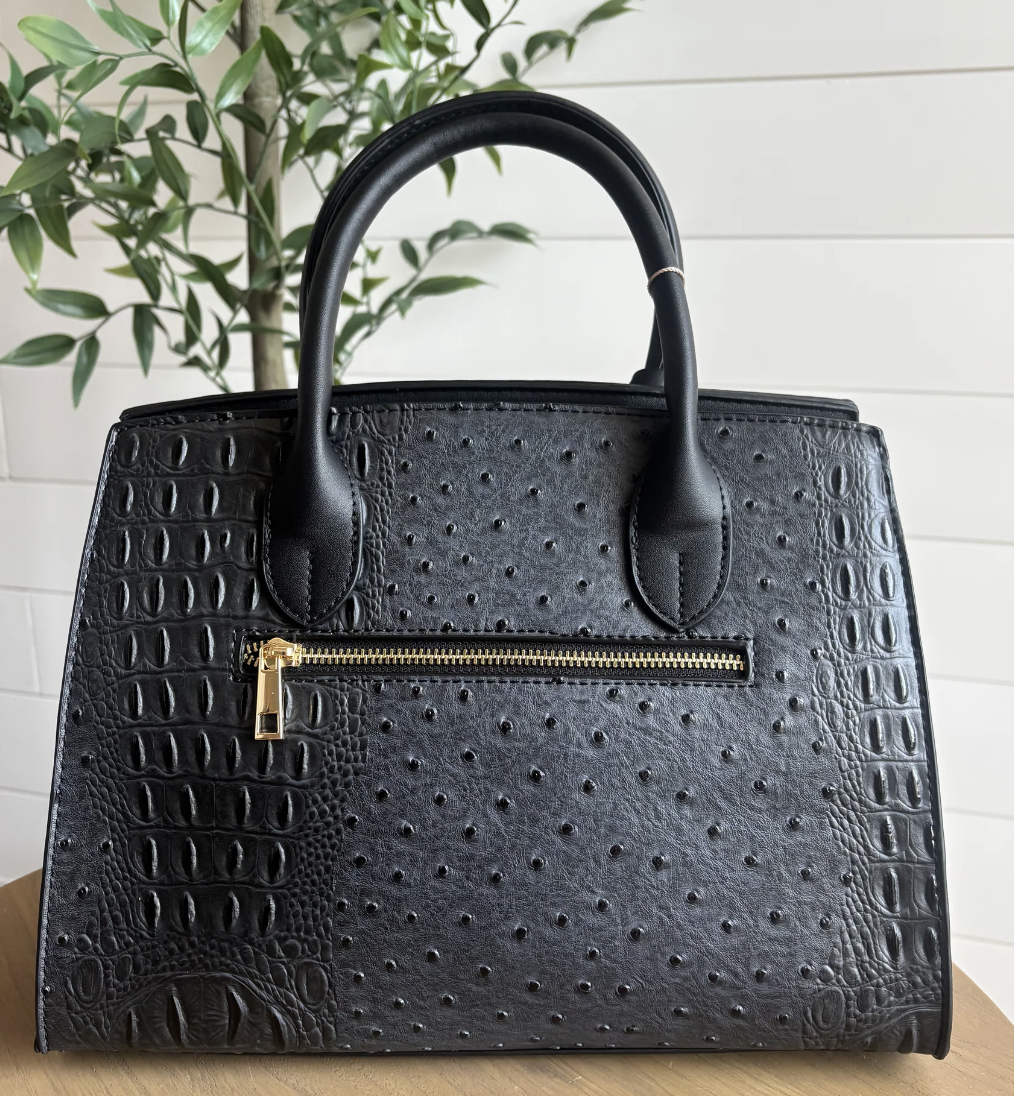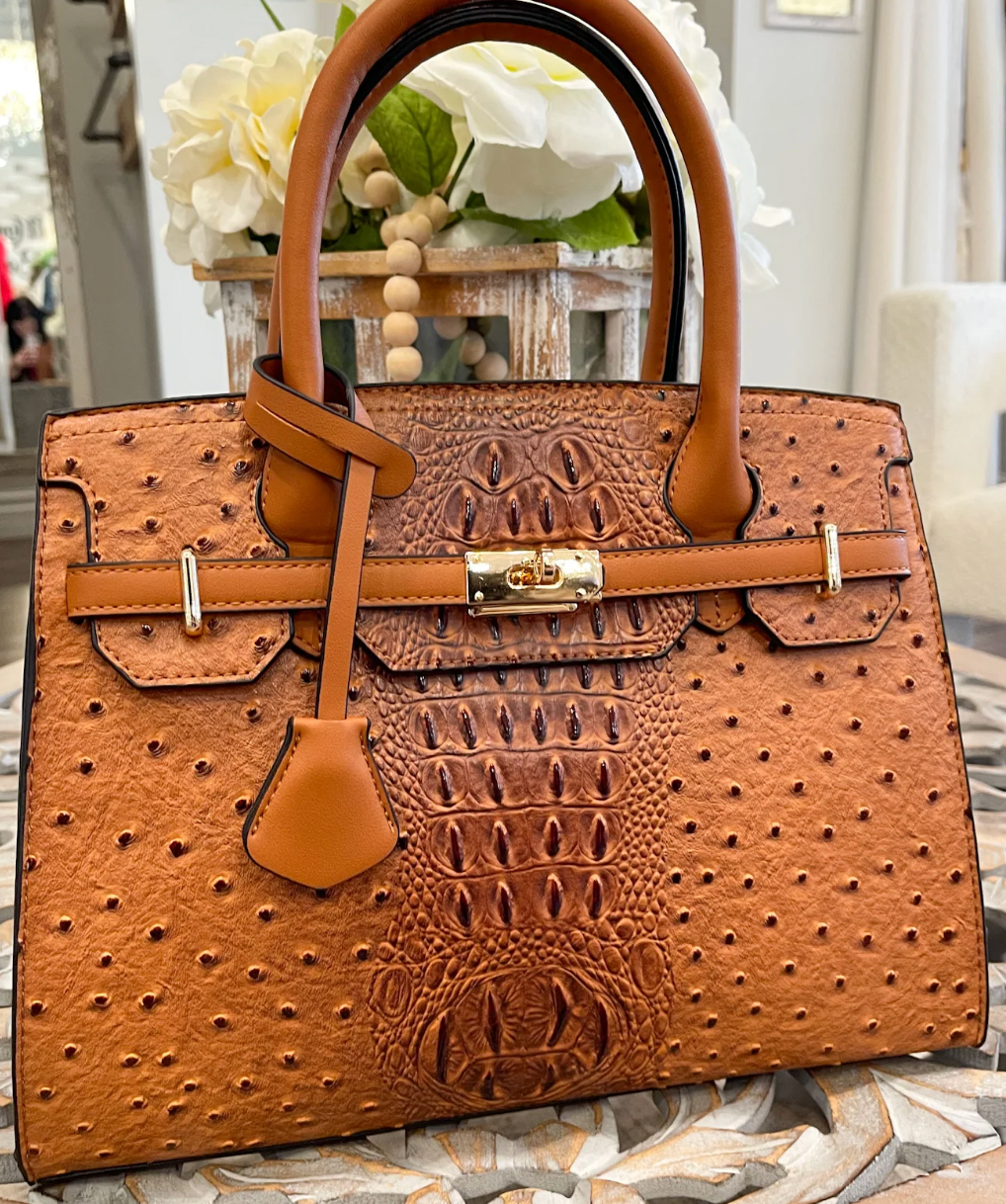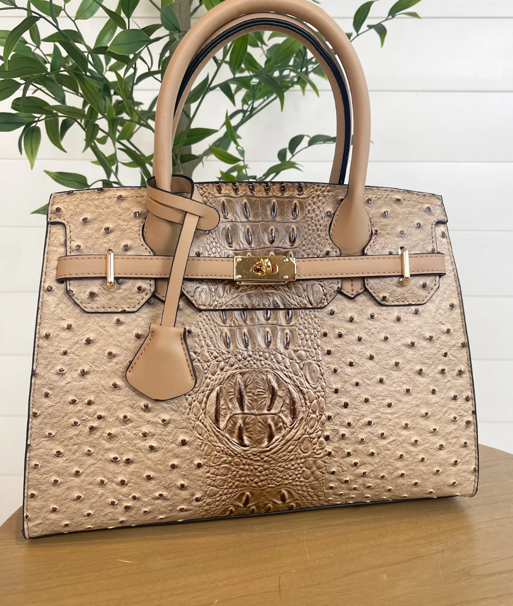 Croc+Ostrich embossed satchel with delicate lock embellishments and a removable shoulder strap. PRODUCT DETAILS: