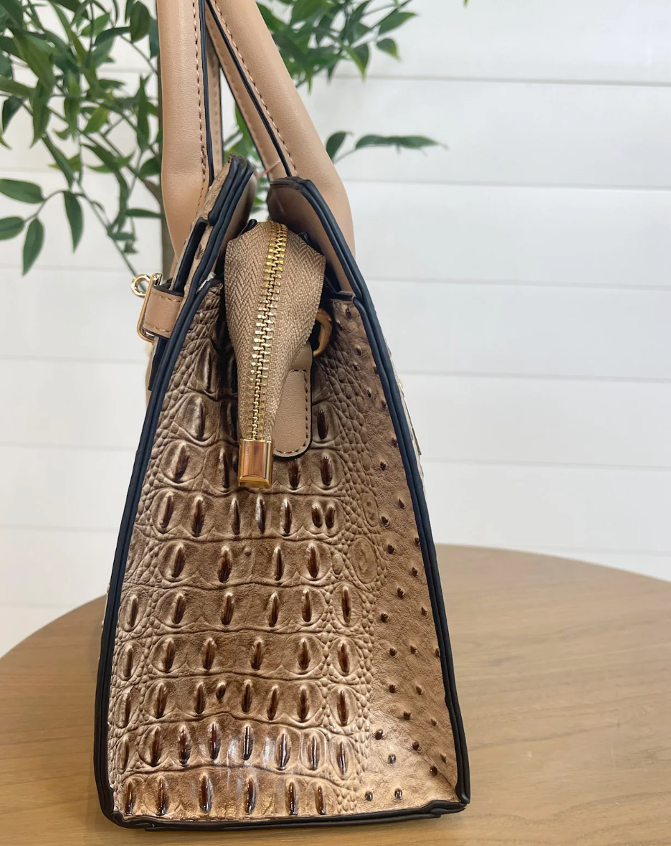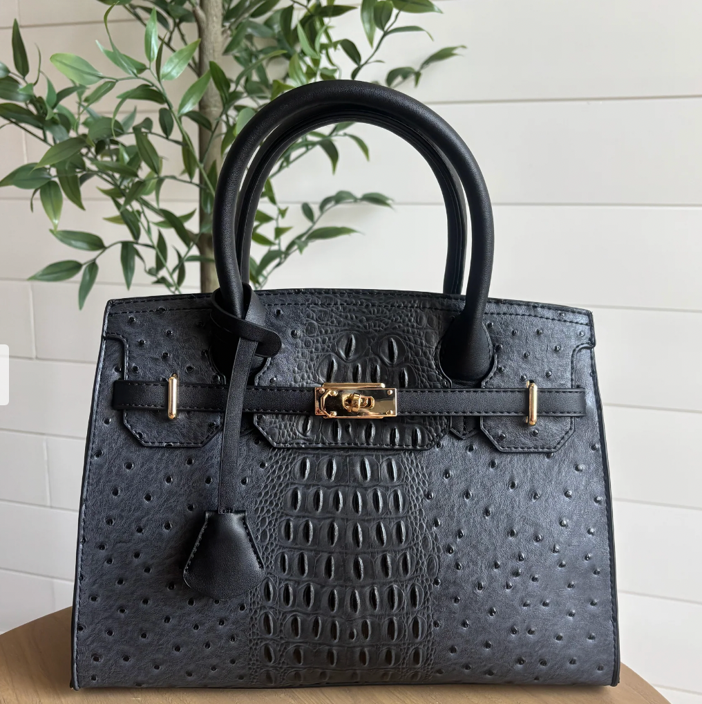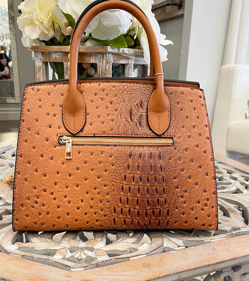 Croc+Ostrich embossed satchel with delicate lock embellishments and a removable shoulder strap. PRODUCT DETAILS: