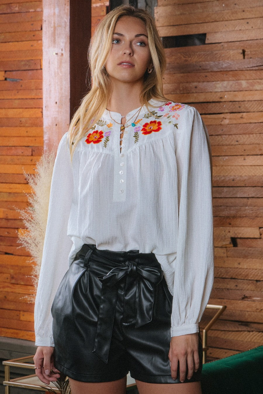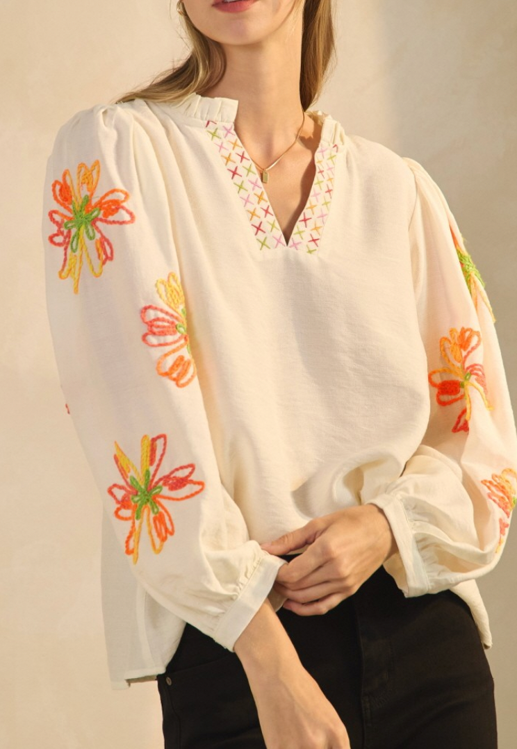 Textured blouse w/ floral embroidery on voluminous sleeves & stitched V-notch neckline