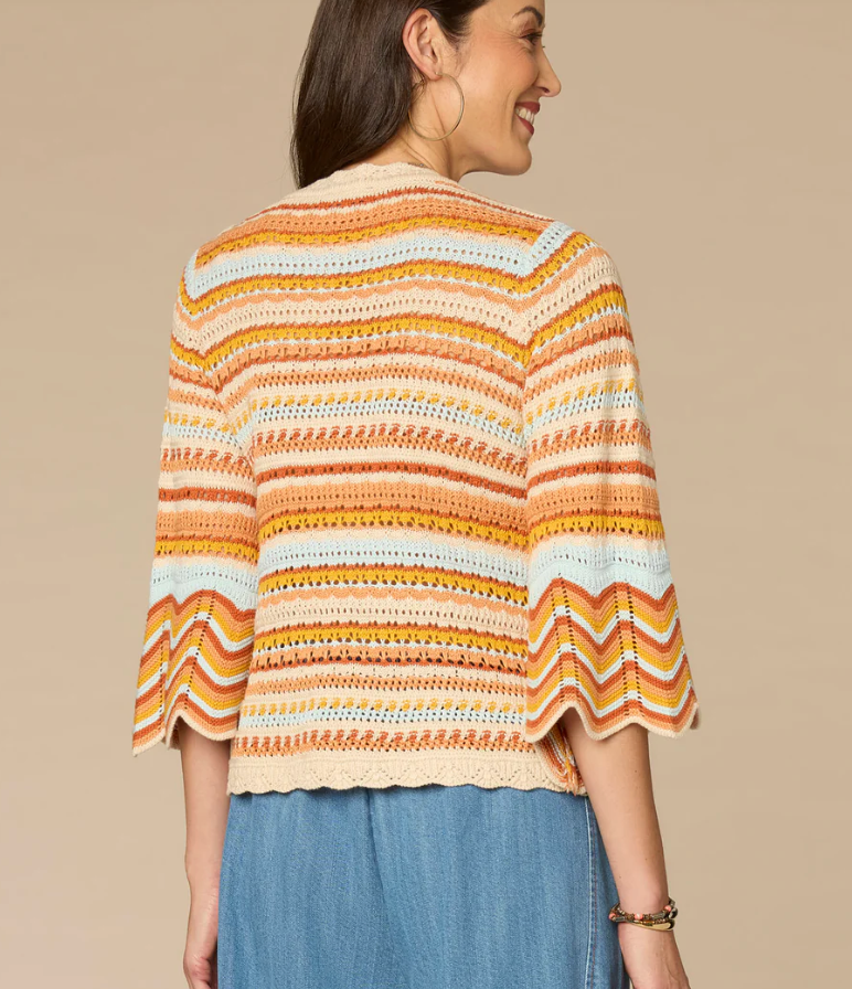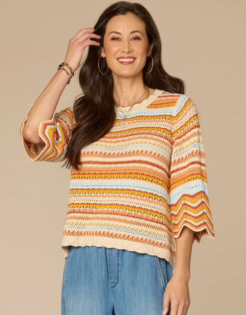 Three Quarter Bell Sleeve Round Neck Scallop Crochet Striped Sweater
