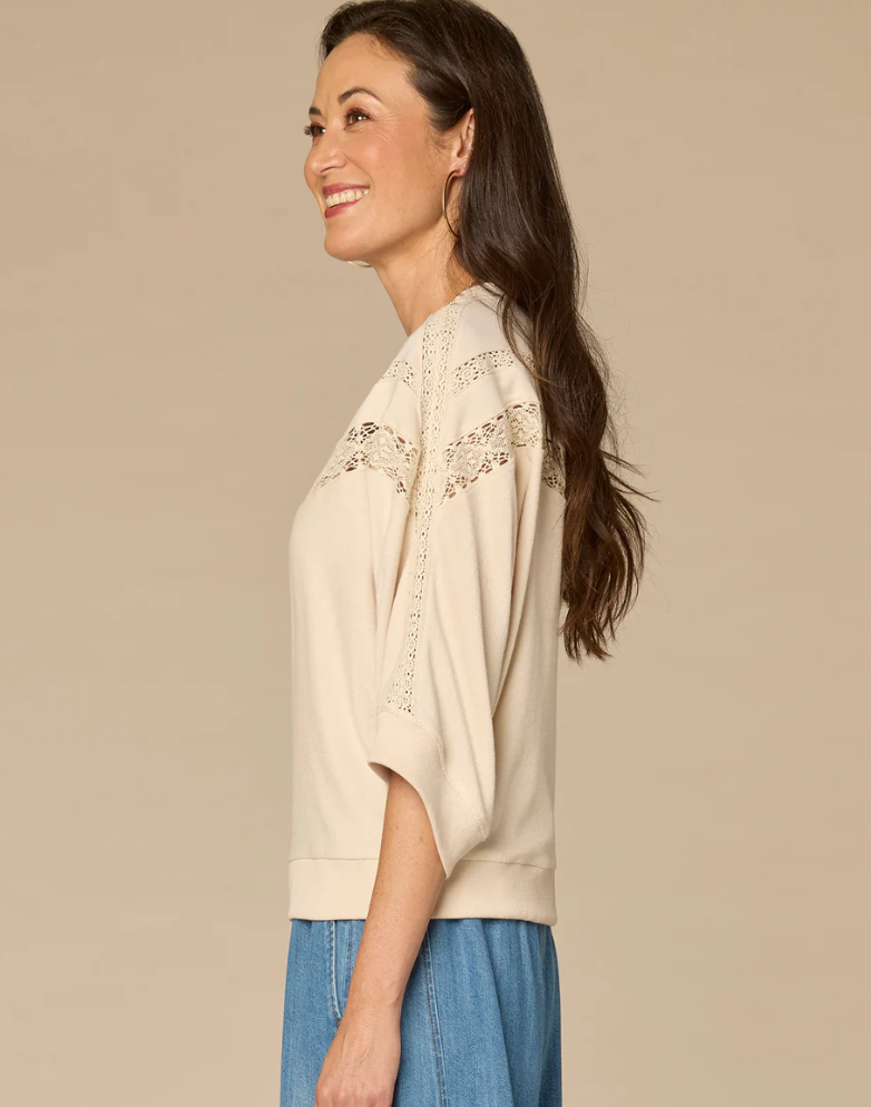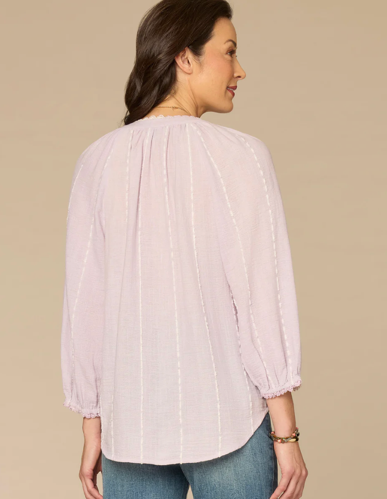 Three Quarter Blouson Sleeve Split Neck Crochet Woven Top w/ Tie