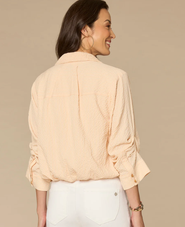 Tucked Sleeve Smocked Button Down Bubble Hem Splice Stripe Woven Shirt