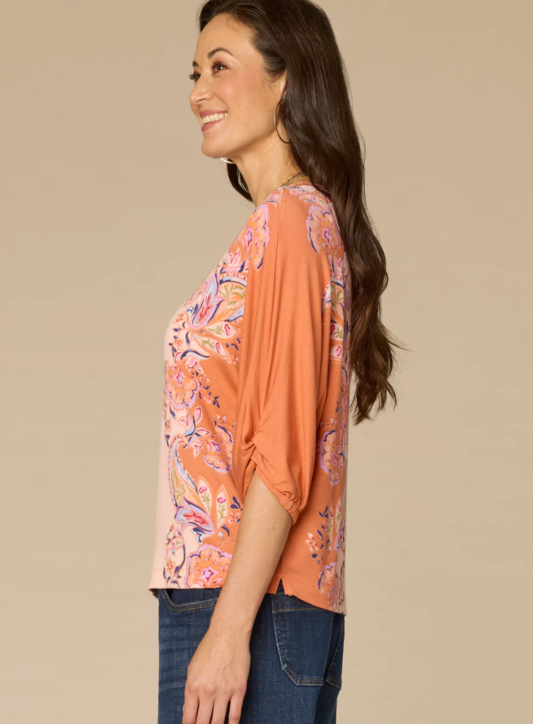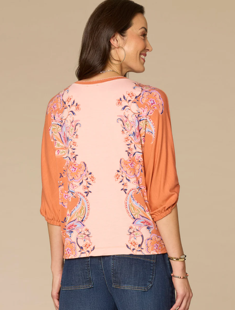 Three Quarter Blouson Sleeve Scoop Neck Placement Print Knit Top