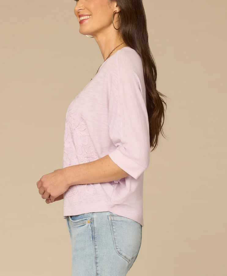 Three Quarter Dolman Sleeve Scoop Neck Floral Embroidered Knit Top