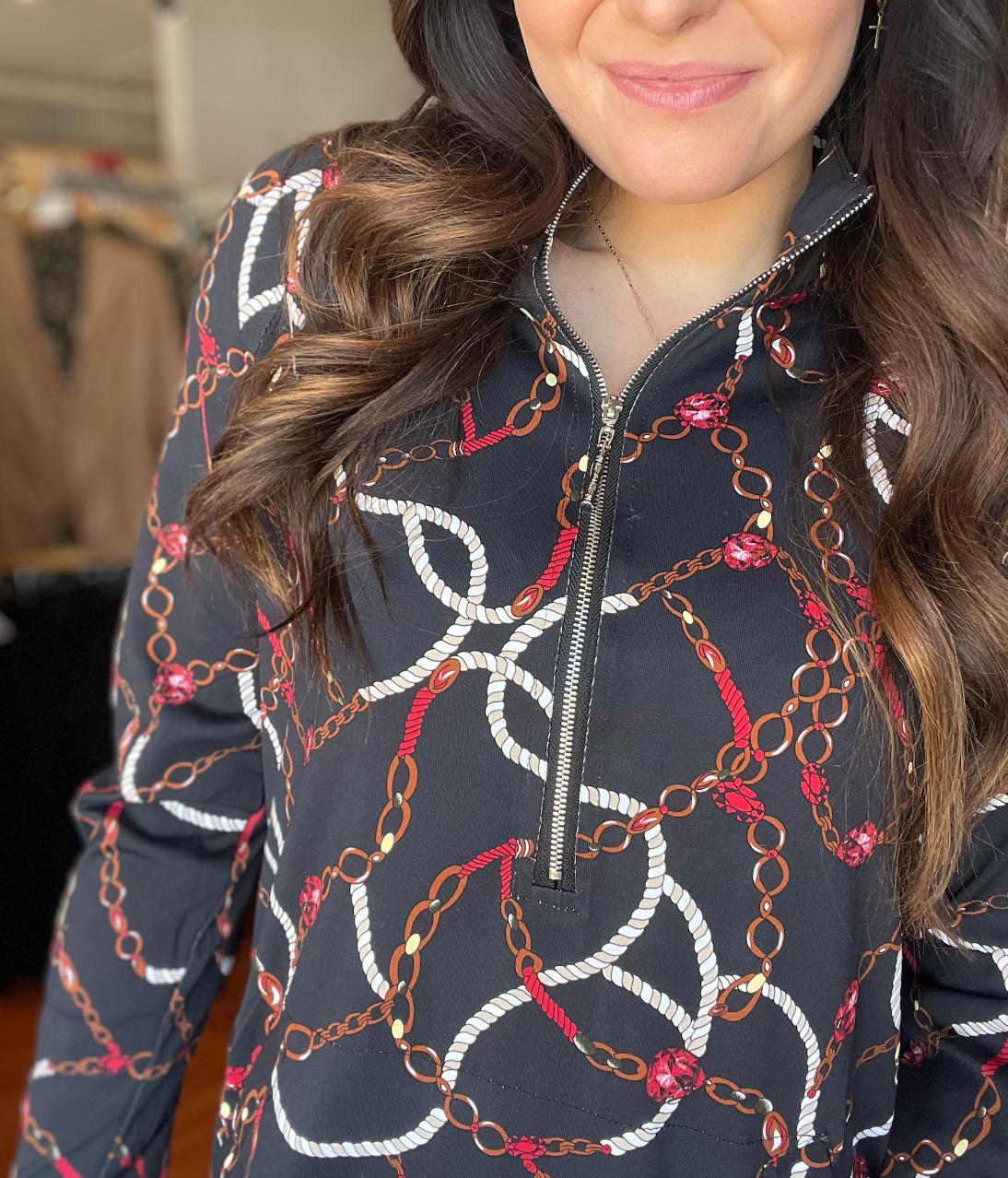 UPF 50+ Quarter Zip Kangaroo Pocket Long Sleeve Chain Print Top