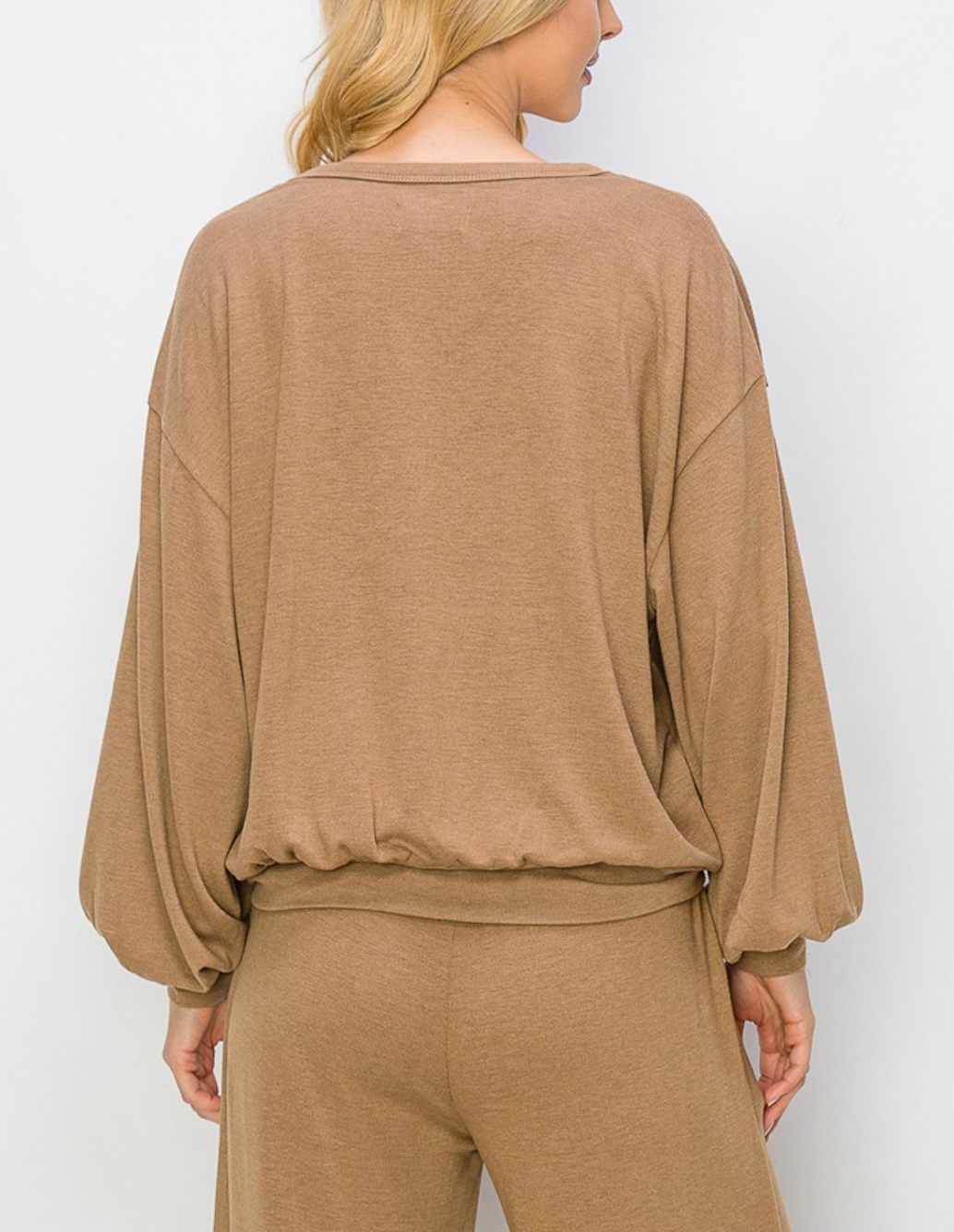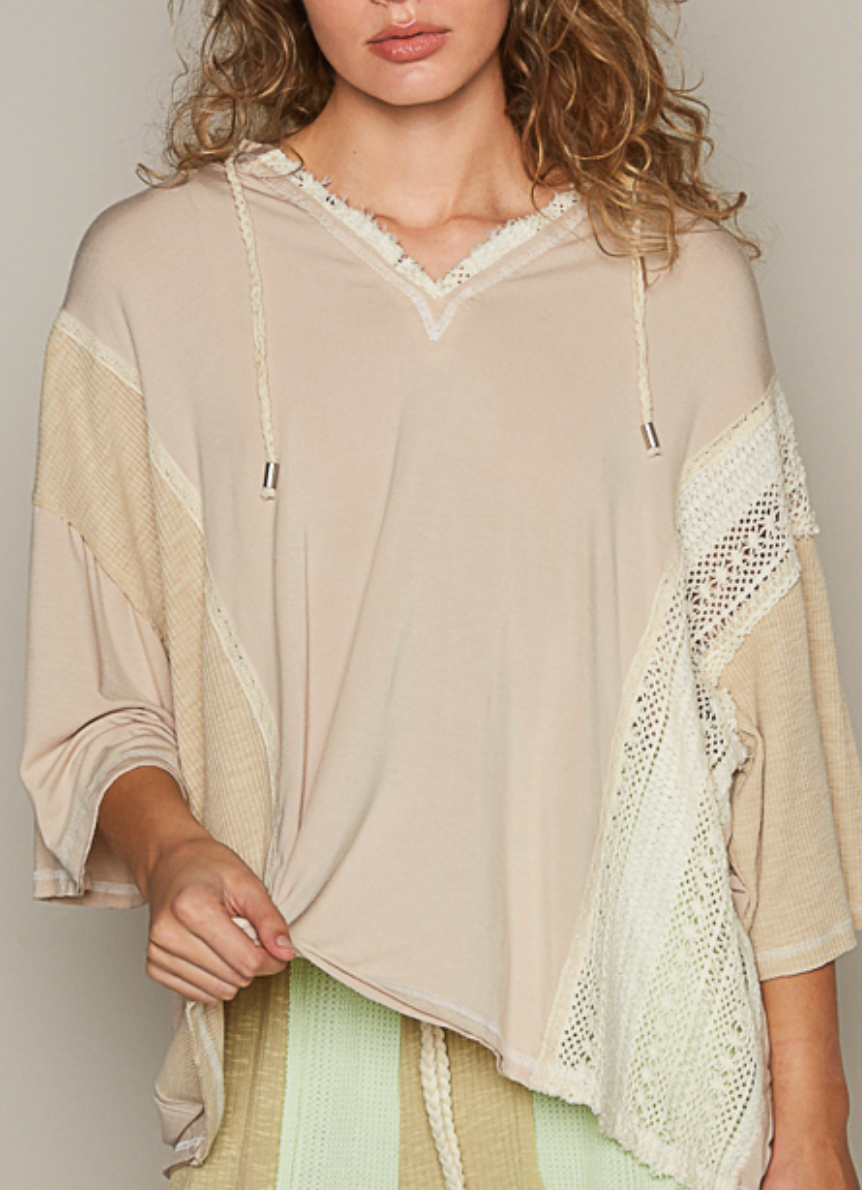 V-neck three quarter sleeve hoodie top w/ crochet patch, overlock stitch, raw edge & vintage washing