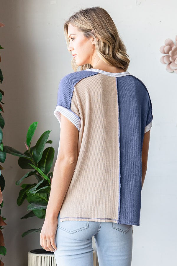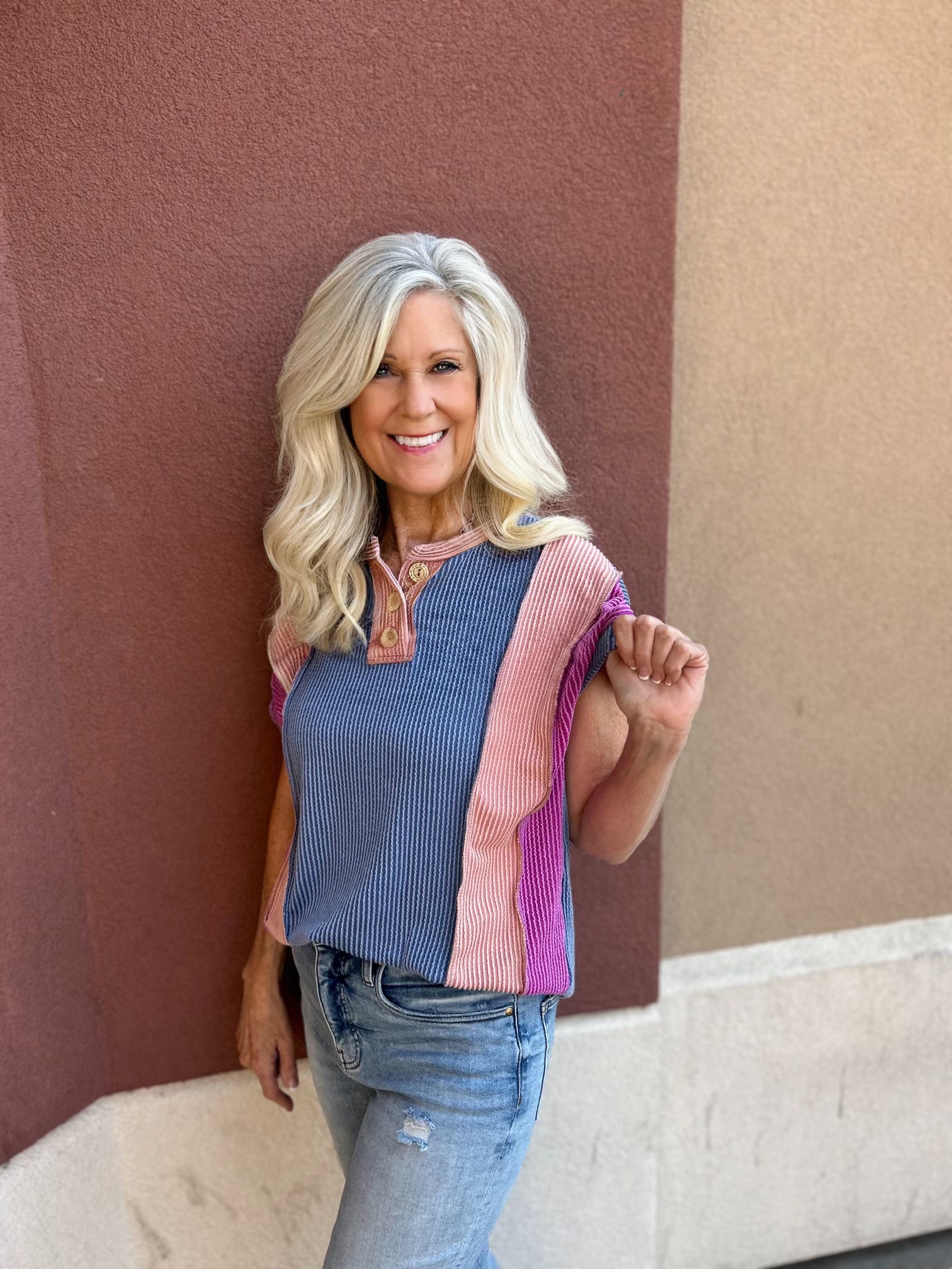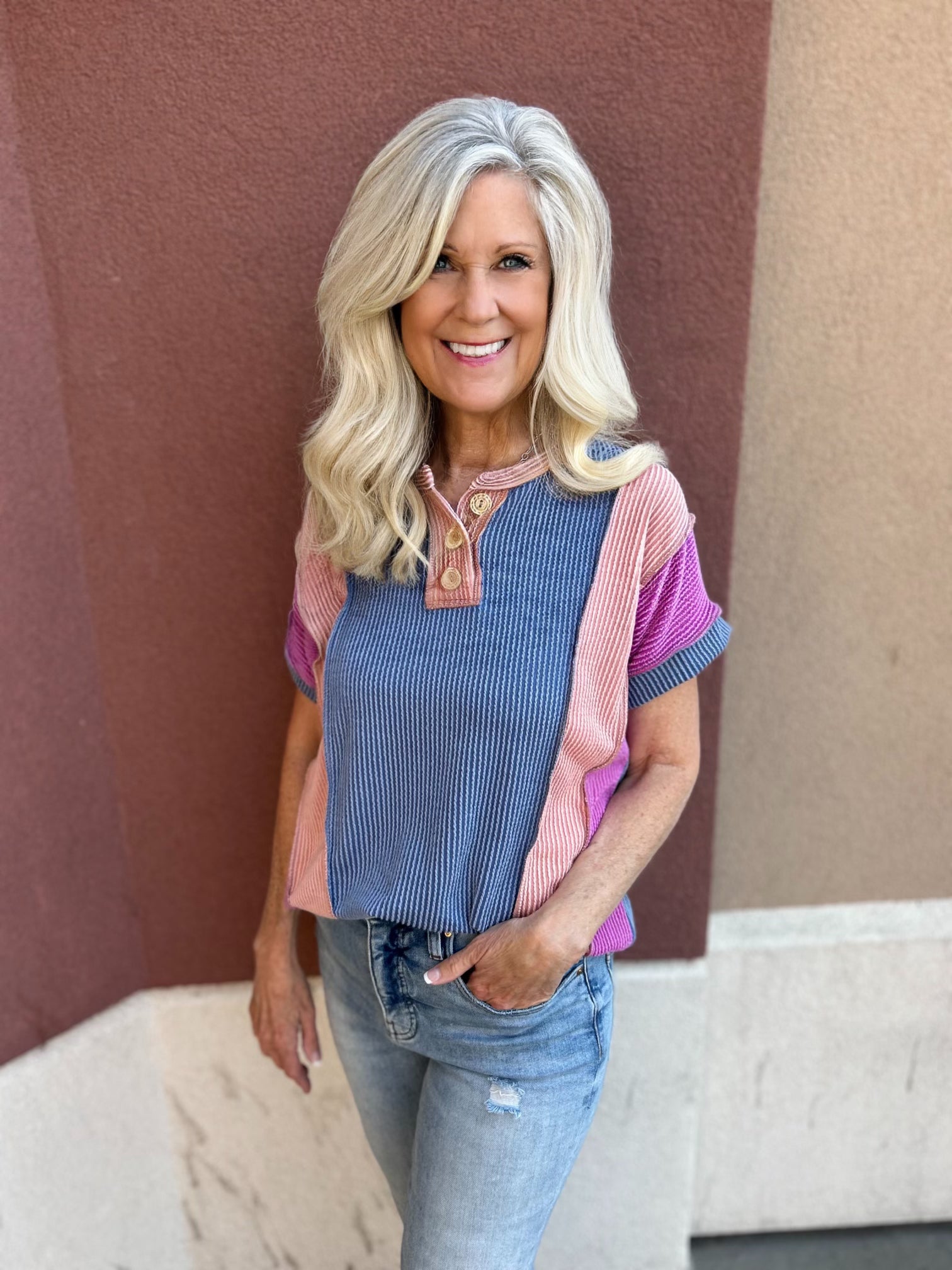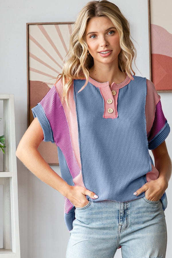 Color Block Button Front Hi-Low Top w/ Exposed Seams