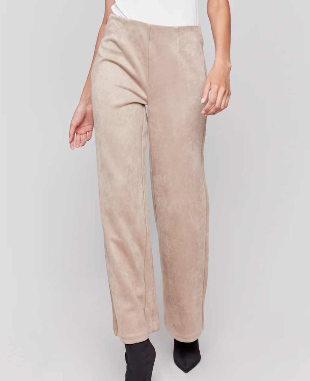 These truffle colored suede pull-on wide-leg pants offer an elevated yet comfortable fit, perfect for creating a sophisticated and chic outfit.