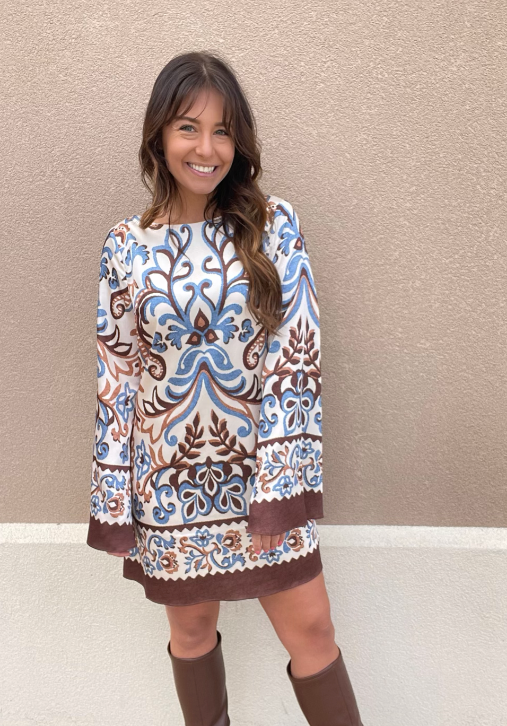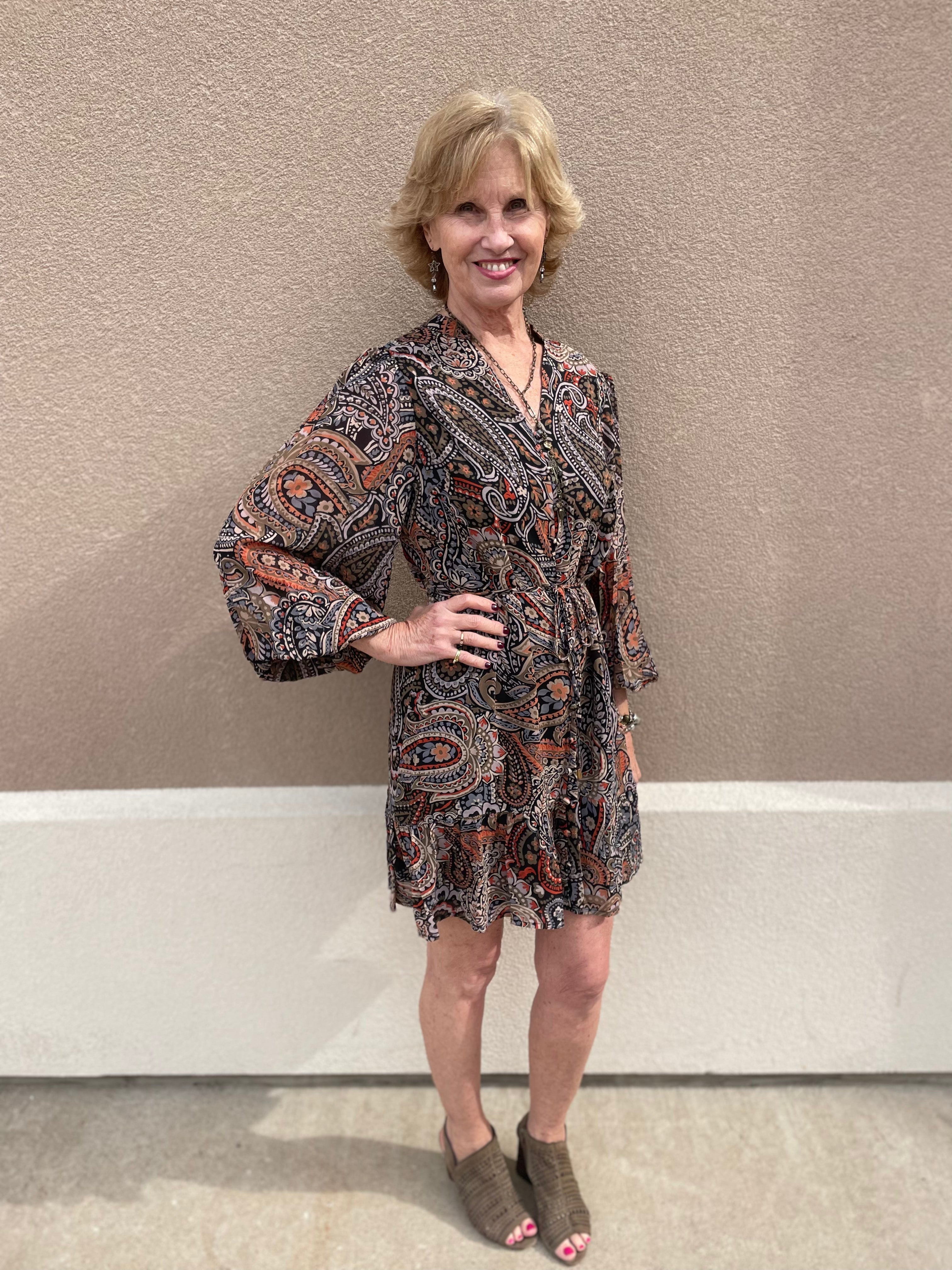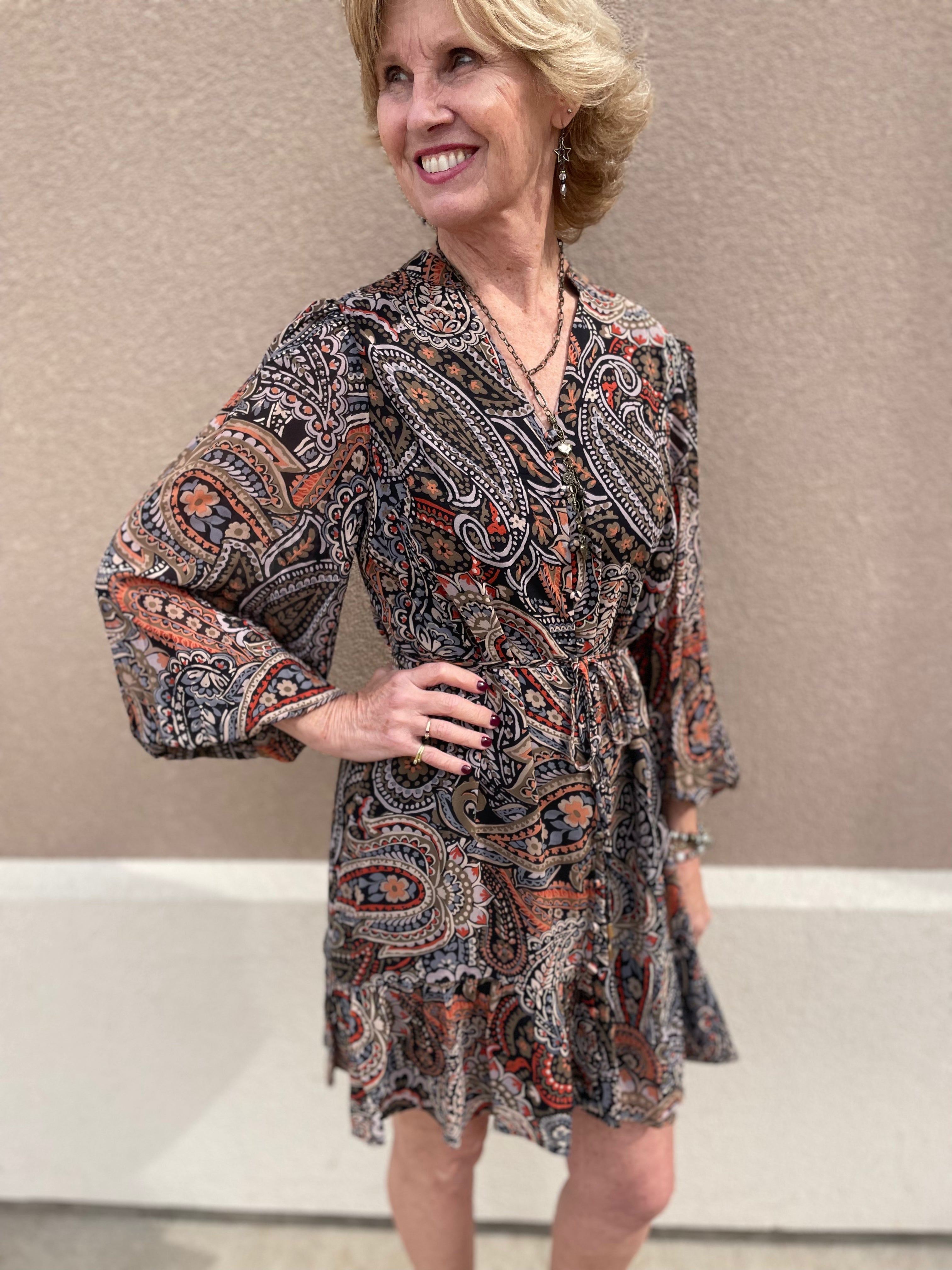 Paisley Long Sleeve Dress w/ Ruffle Hem & Tie Waist