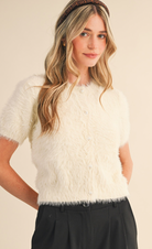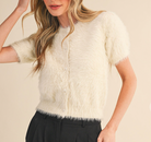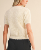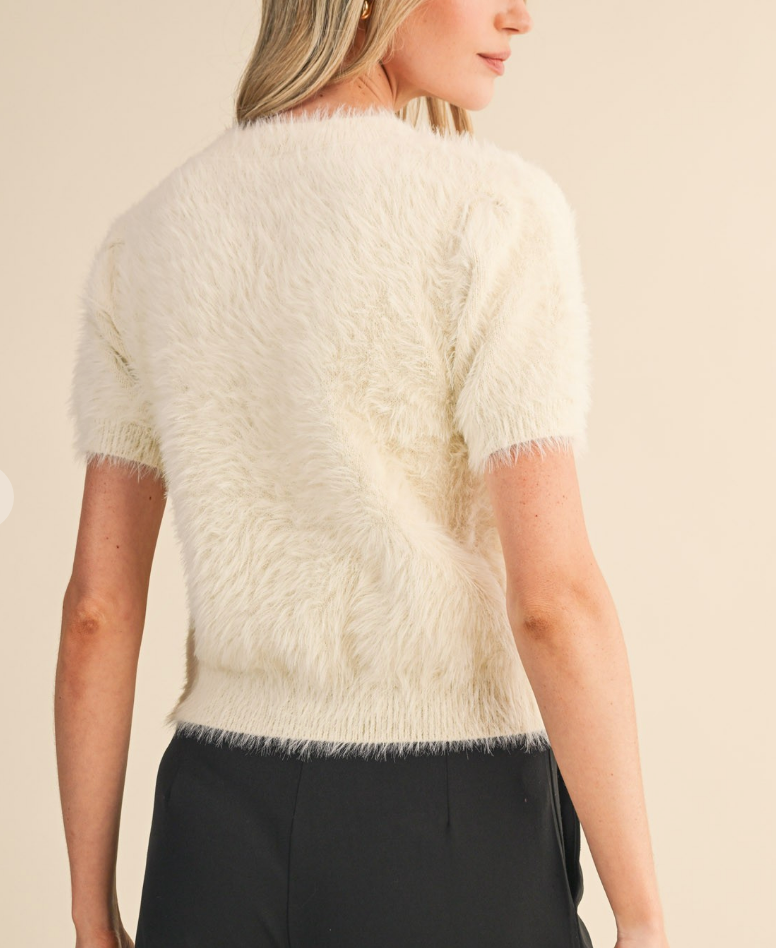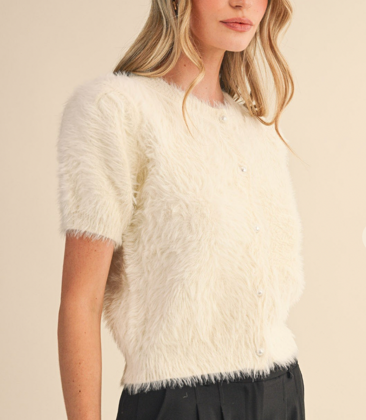 + Fuzzy mohair knit short sleeve sweater cardigan + Round neckline + Button down placket + Pearl buttons + Short puff sleeves + Relaxed, waist length fit