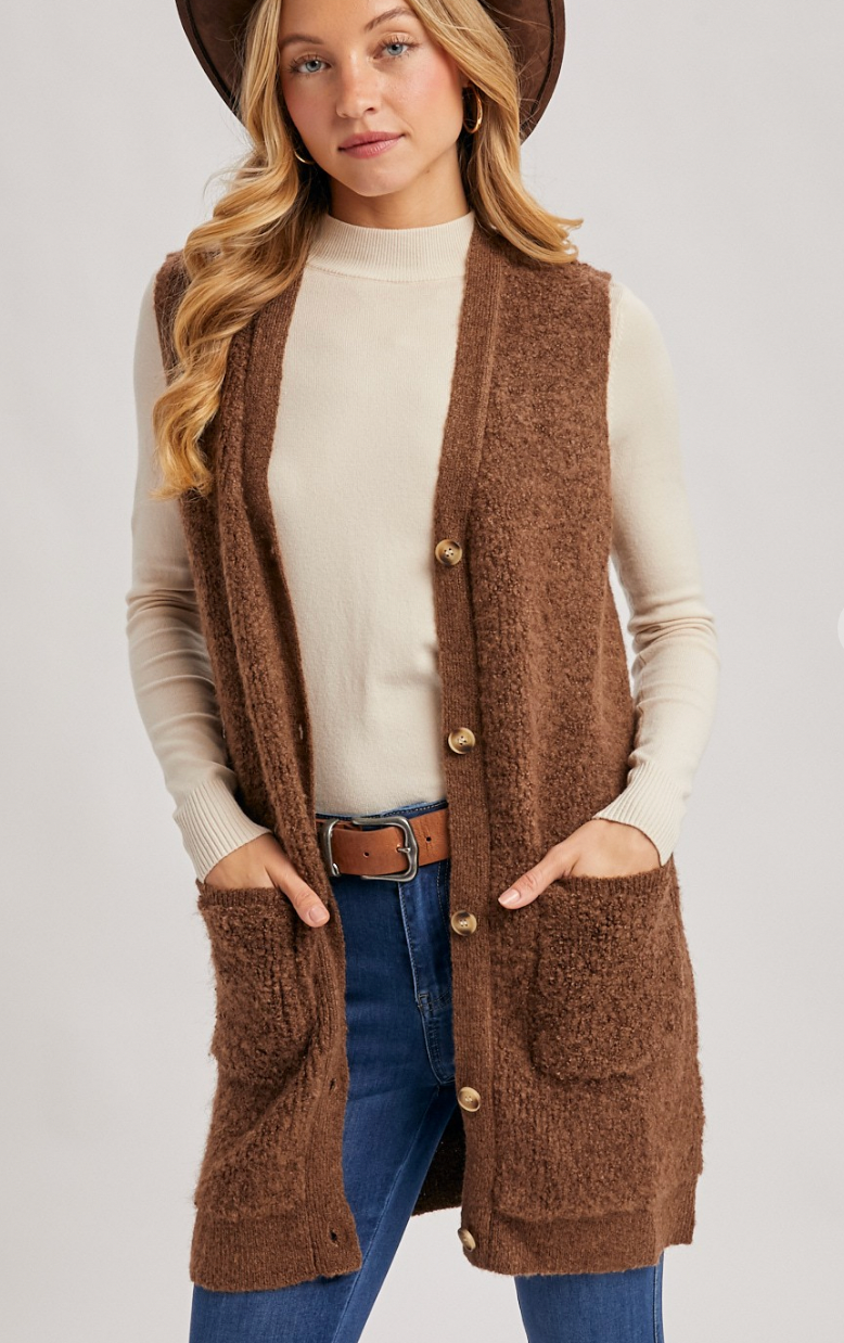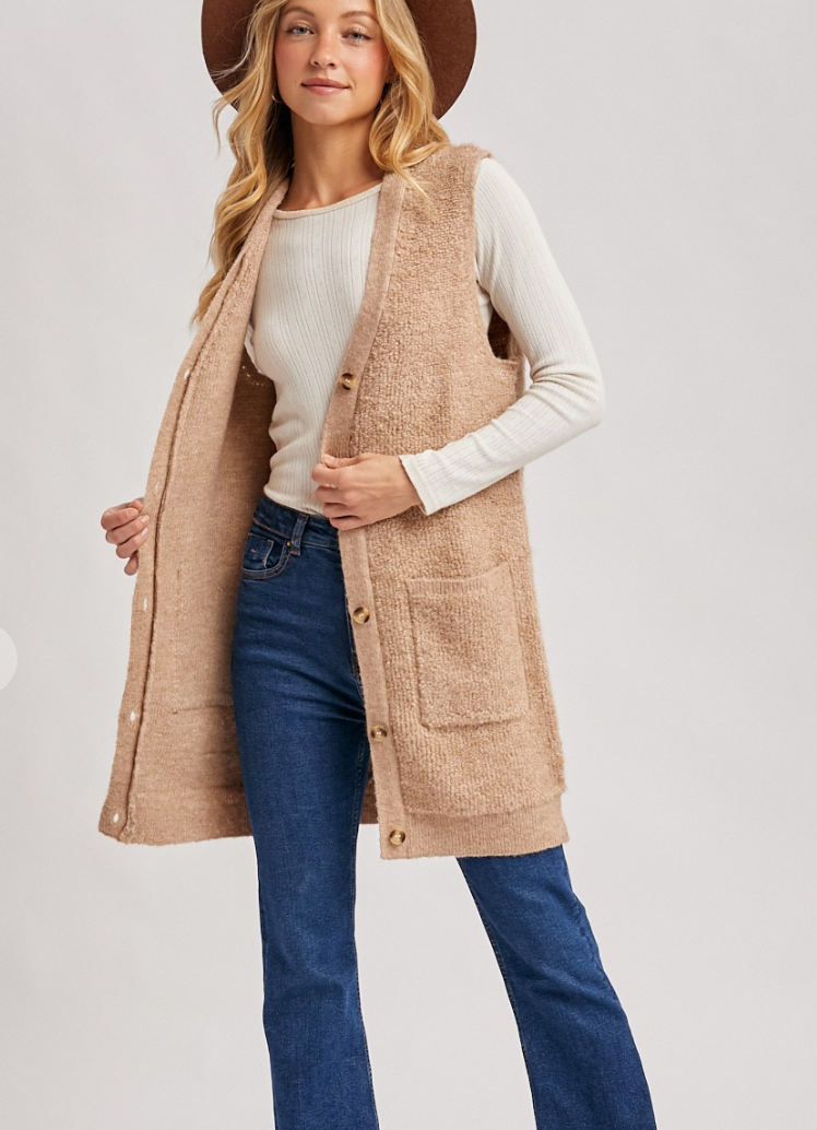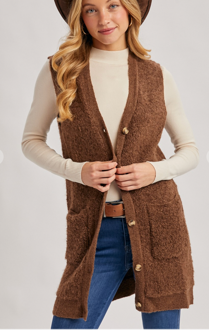 Button down V-neck teddy knit long lined vest. This cozy vest features a plush teddy knit fabric that adds a touch of warmth and texture to your outfit. The button-down front and V-neckline create a classic and versatile look, while the longline silhouette ensures extra coverage and comfort. Perfect for layering over your favorite tops and sweaters, this vest combines style and functionality for a chic and cozy ensemble.