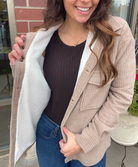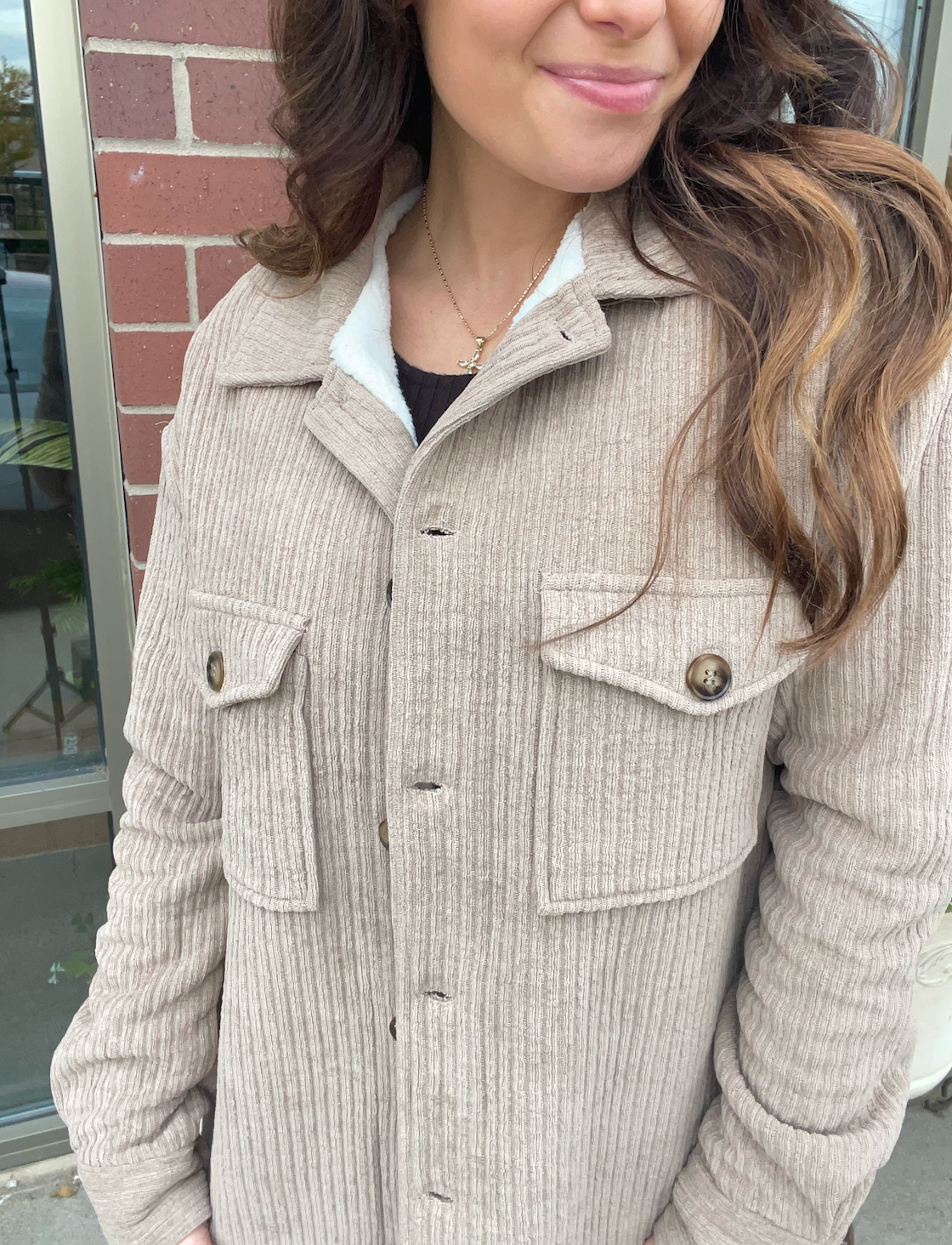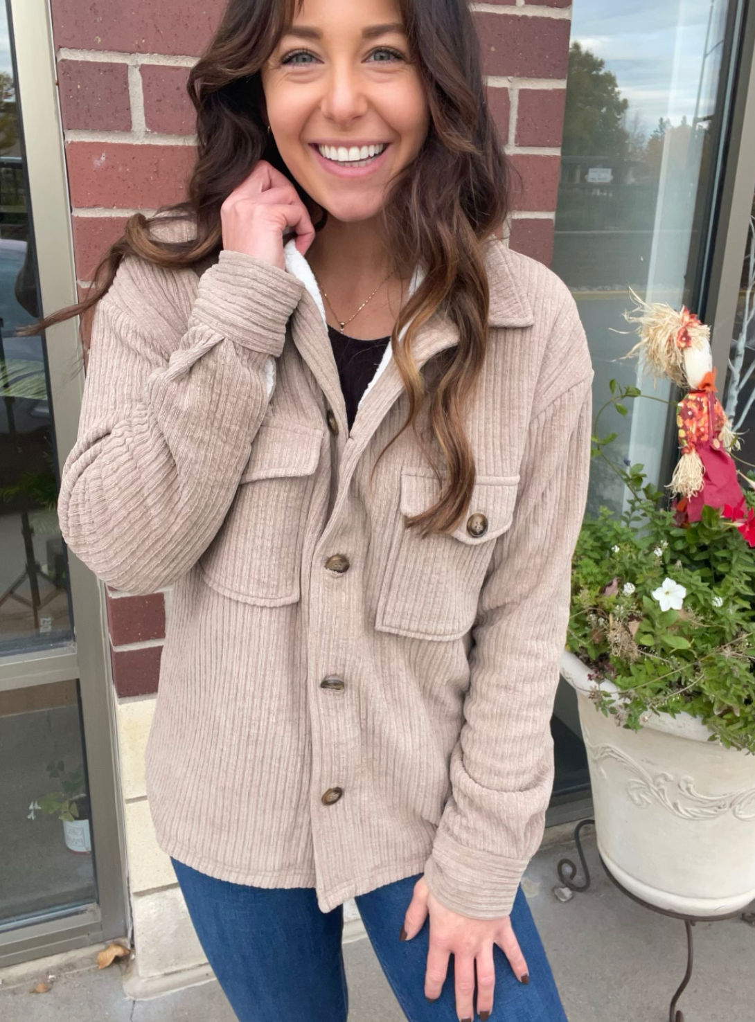 Wrap yourself in comfort with this adorable corduroy jacket that's equal parts cozy and chic. Featuring a soft corduroy exterior paired with plush fur lining, it's designed to keep you toasty through chilly days. The classic neutral tone pairs effortlessly with any outfit, while dual chest pockets add practical style. Perfect for casual outings, weekend adventures, or just lounging in style!