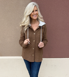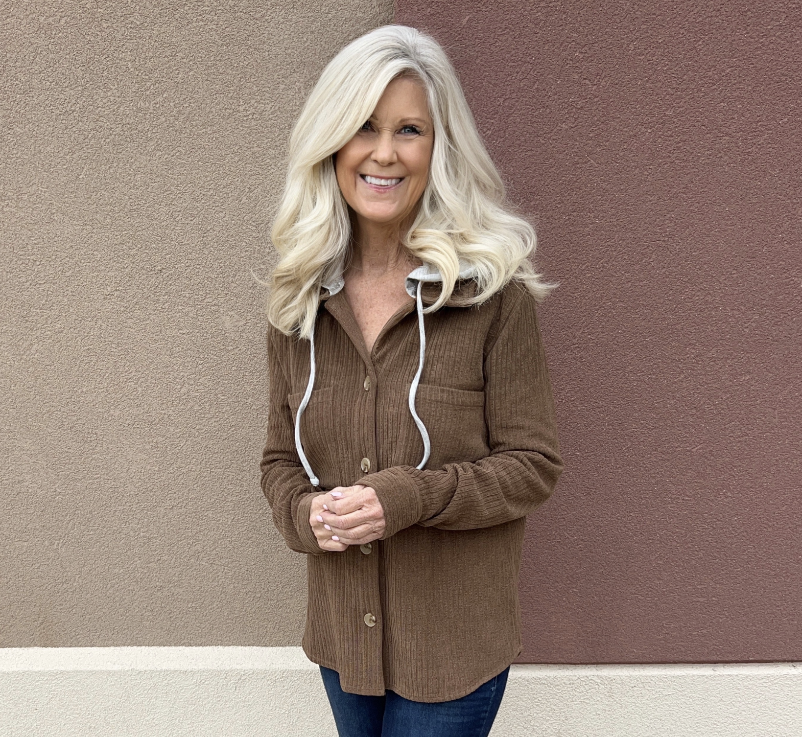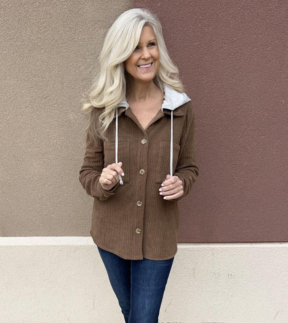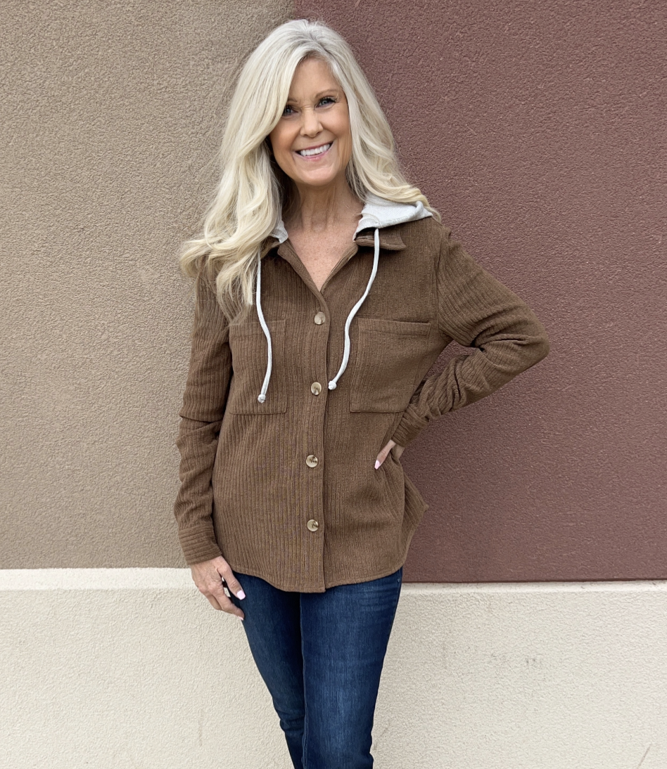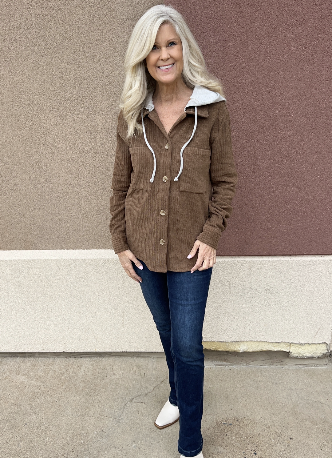 This hooded insert shacket features a ribbed texture and a soft grey hoodie lining for added comfort. Lightweight yet stylish, it is detailed with elegant tortoise buttons, creating a refined layering piece perfect for transitional weather.