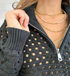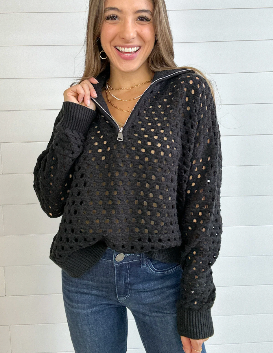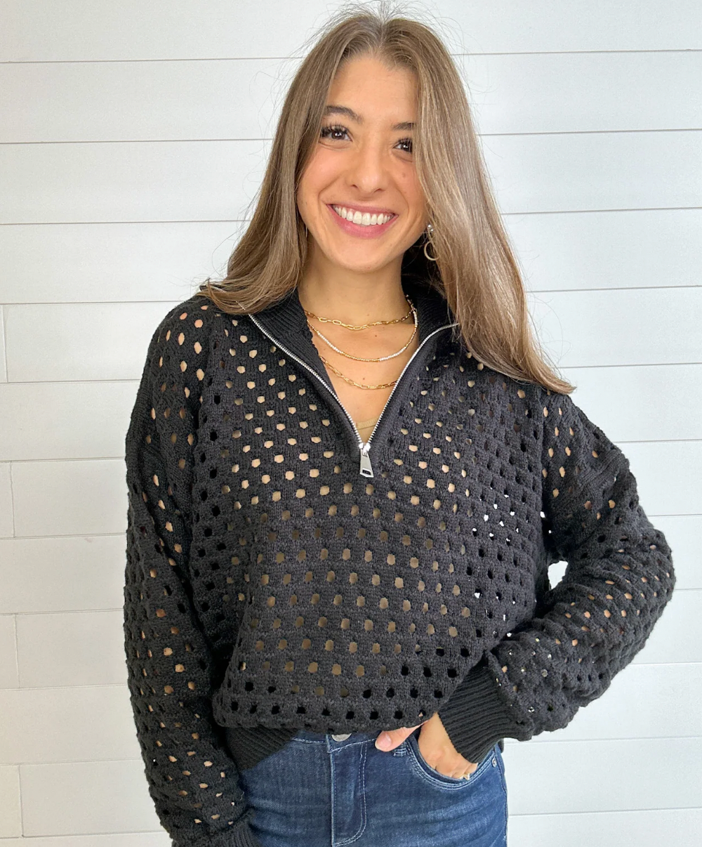 The Half Zip Open Knit Sweater features a standout circle-patterned weave that’s equal parts lightweight and statement-making. With its casual half zip neckline and airy texture, it’s the perfect throw-on layer for transitional weather or adding a little edge to your everyday look.