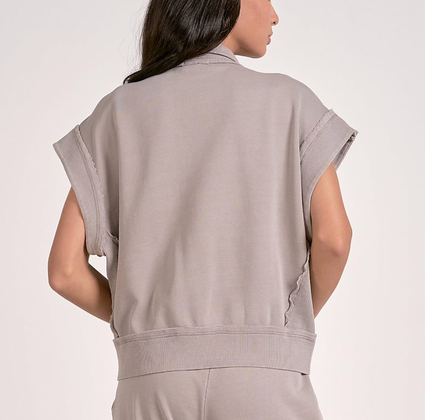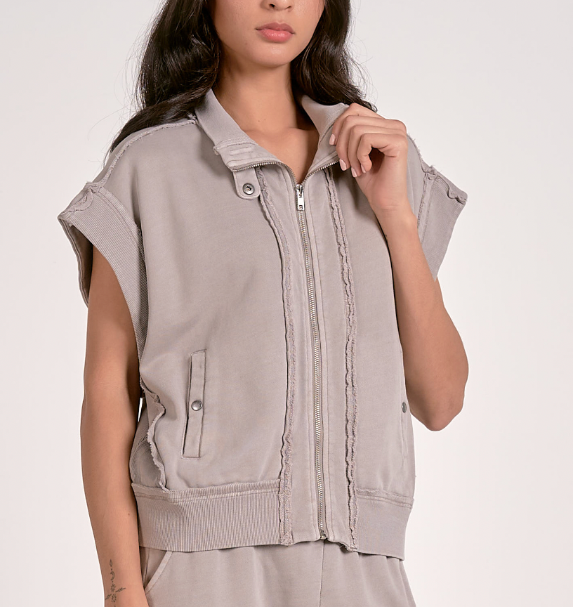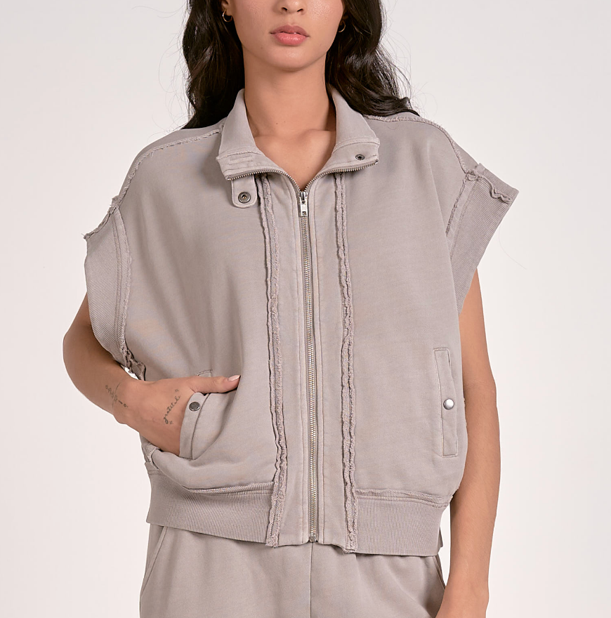 Crafted from soft french terry, this vest is all about casual charm with modern details. The exposed seams and frayed hem add just the right touch of edge, while the drop shoulder and hip-length cut make it a versatile layering piece for any season.