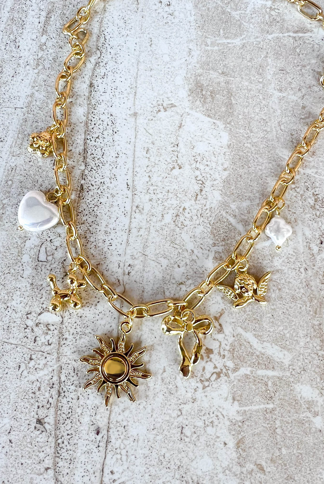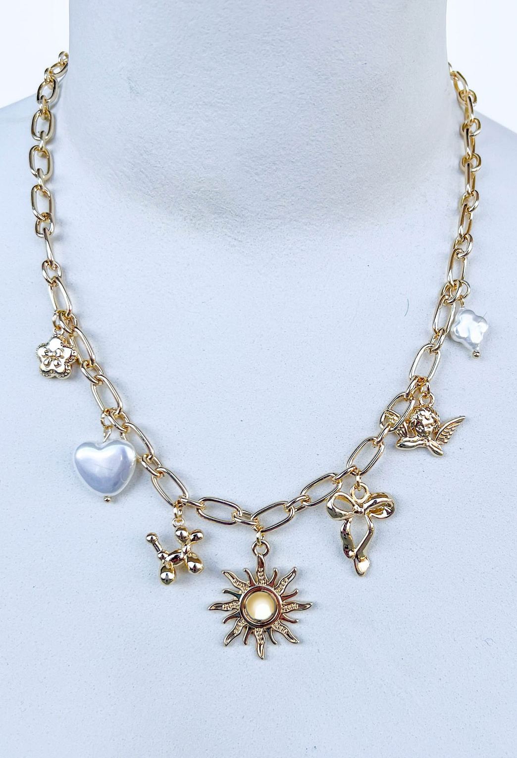 1 layer necklace featuring a gold chain link with a variety of fun jewel charms throughout, featuring a sun charm as the center focal charm.