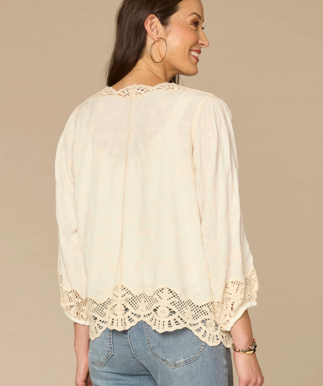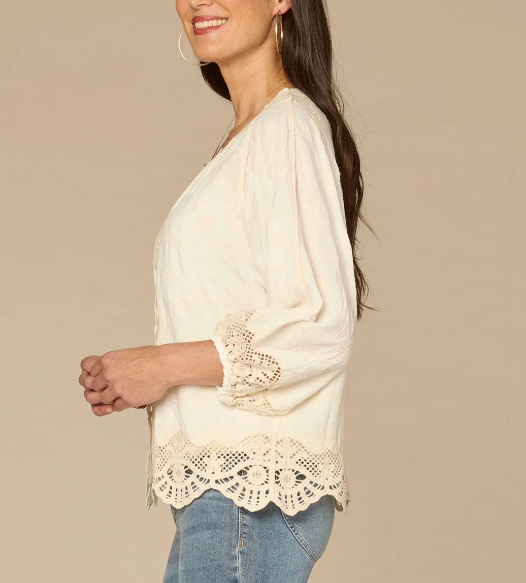 Elevate your layering game with this charming 3/4 sleeve crochet shawl. Delicate embroidered details add a touch of elegance, while the three-quarter length sleeves provide perfect arm coverage for any season. Versatile enough to pair with dresses, tops, or casual wear, this piece brings texture and sophistication to your wardrobe.