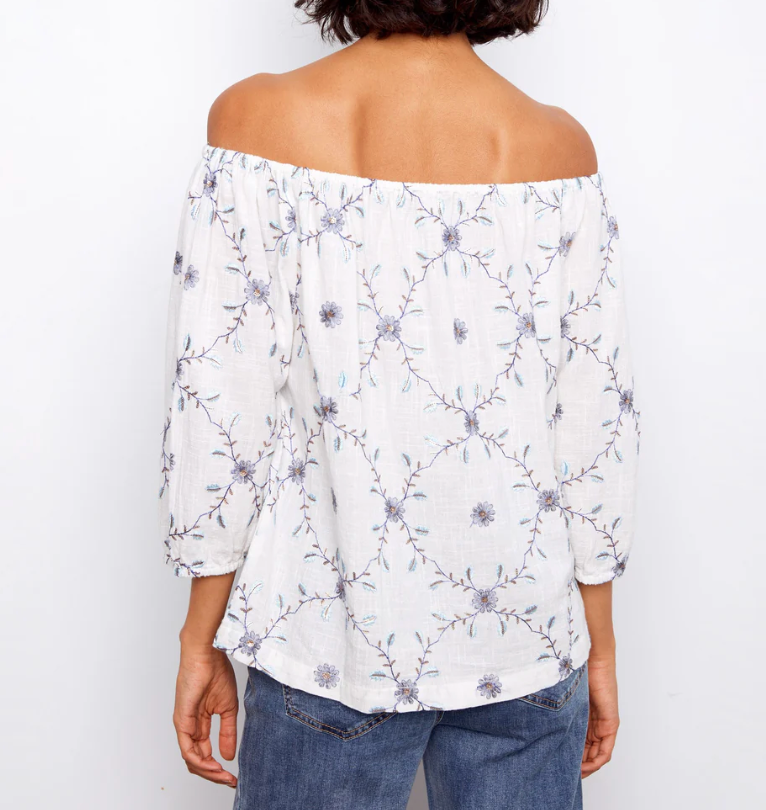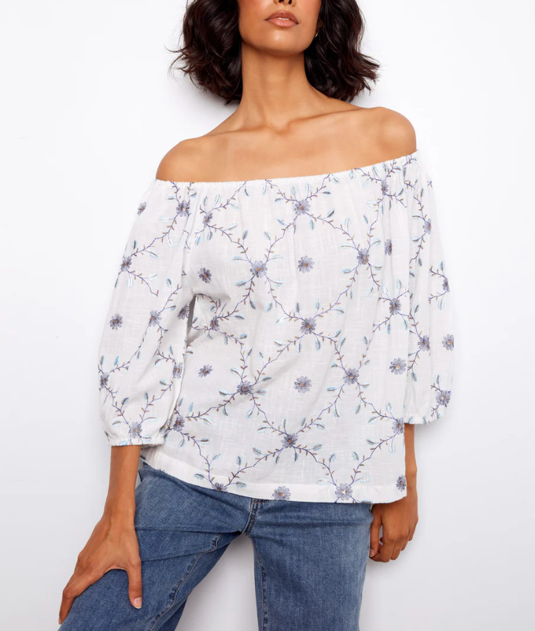Step into the sunshine with this off-shoulder blouse, delicately adorned with floral embroidery for a touch of romantic charm. Crafted from crisp and breathable cotton, it keeps you cool. Its versatile silhouette pairs beautifully with your favorite jeans or a flowing skirt, making it a must-have for the spring-summer season.