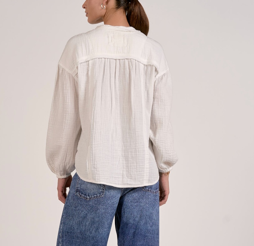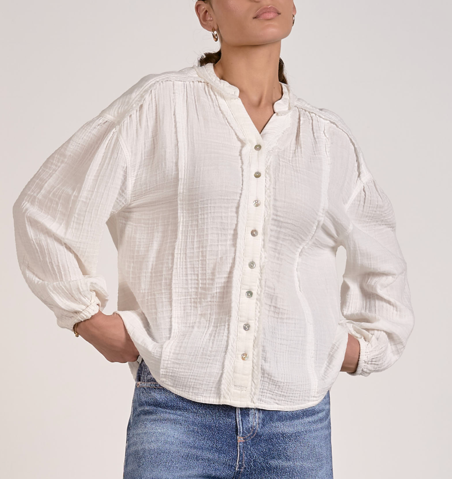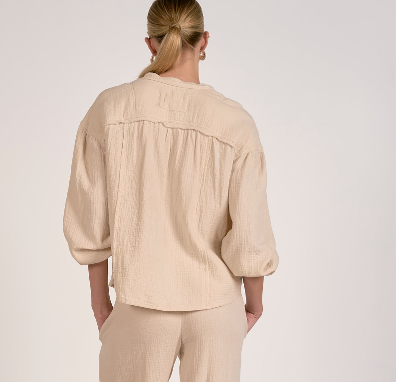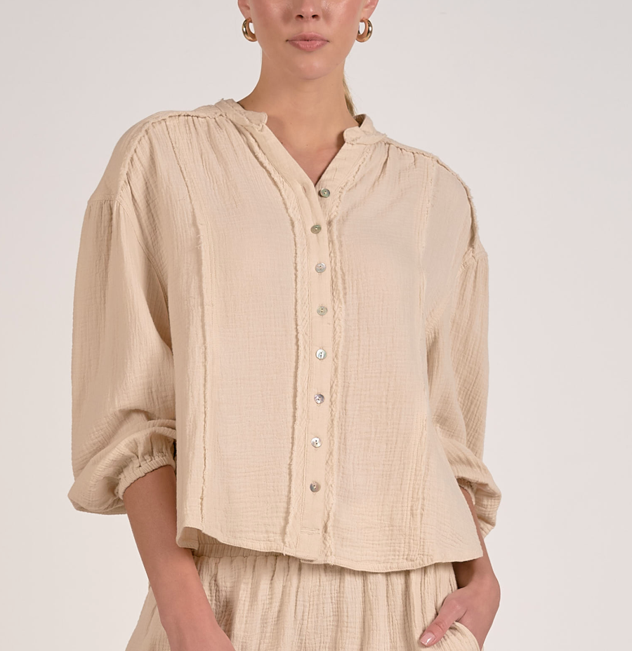 Effortlessly chic and undeniably comfortable, this long sleeve gauze button up top embraces a relaxed, loose silhouette that moves with you. Exposed seams add an intentional, laid-back aesthetic that feels both modern and timeless. The lightweight gauze fabric breathes beautifully, making it perfect for layering or wearing solo. A versatile staple that transitions seamlessly from casual days to weekend adventures.