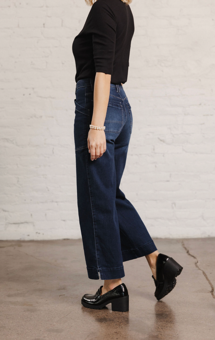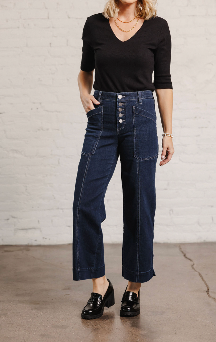 Step up your denim game with the Mac and Me Button Fly Wide Leg jeans. Featuring a chic button fly closure, slant side pockets, and contrast stitching against rich indigo denim, these jeans are guaranteed to be a wardrobe favorite. With a flattering 10” rise, 22” leg opening, and an ankle grazing 27” inseam, these Mac and Me’s are designed to show off your favorite footwear.