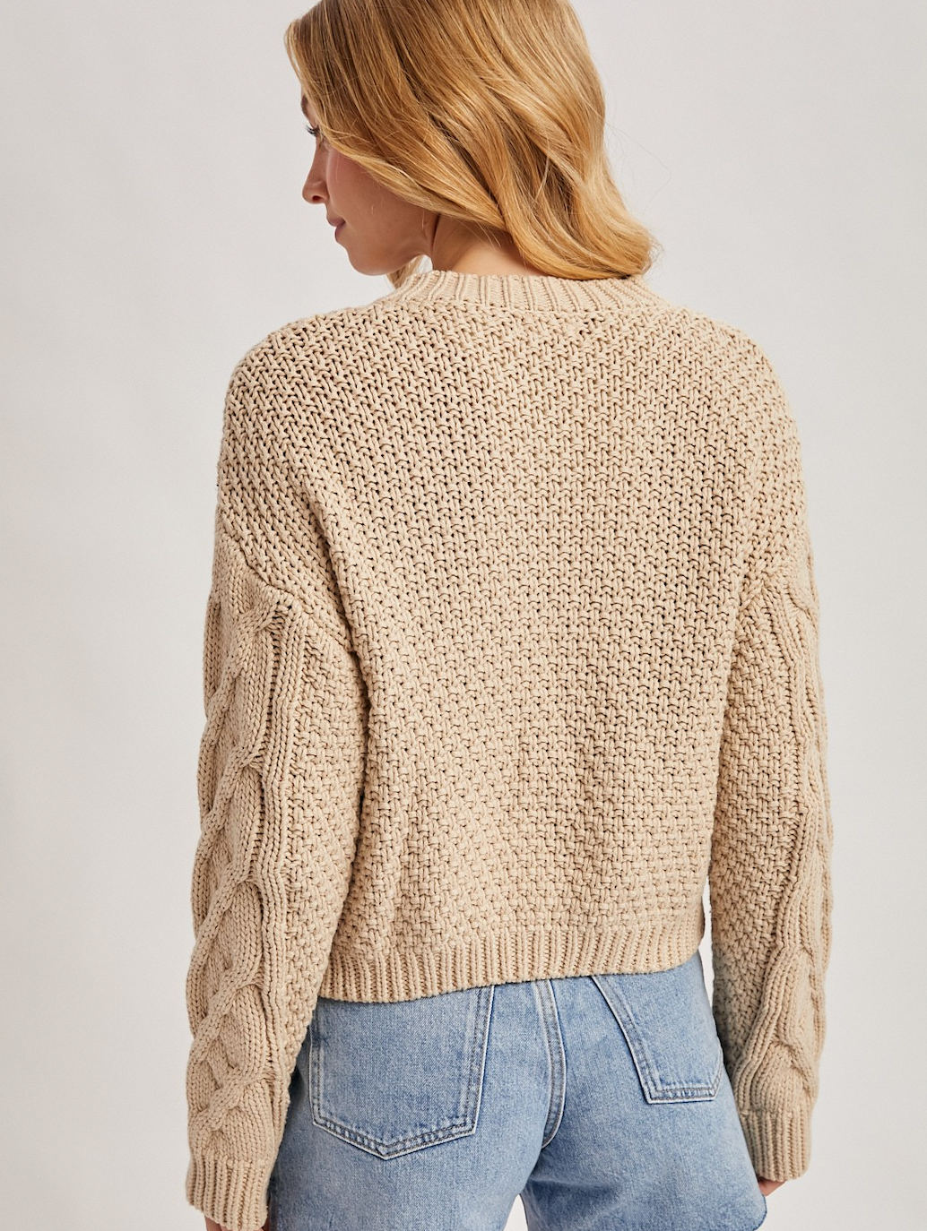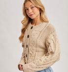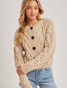 This cozy and classic cardigan is a timeless piece perfect for layering. It features an intricate, all-over cable knit design that provides rich texture and visual appeal. The traditional crewneck silhouette is updated with a modern cropped length and is finished with a row of large, contrasting dark brown buttons down the front. With its comfortable fit and versatile style, this sweater is an essential for adding warmth and charm to any casual outfit. Fabric Contents- 100%COTTON