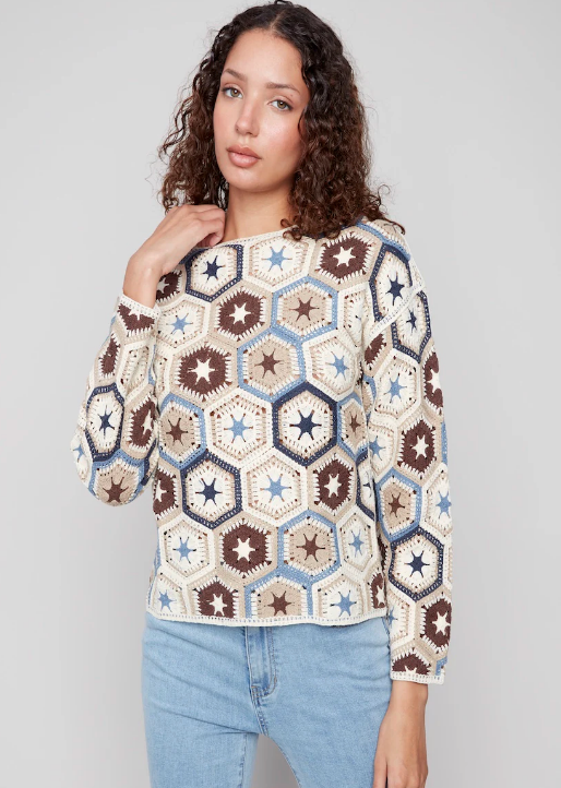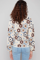 This crochet top is a beautifully crafted, vintage-inspired piece that features a striking geometric and starburst pattern made up of hexagonal crochet motifs. The top is entirely composed of hexagon-shaped crochet patches, each with a starburst motif in the center. These tones are warm, cozy, and versatile, making the top perfect for transitioning between seasons—especially into Fall.