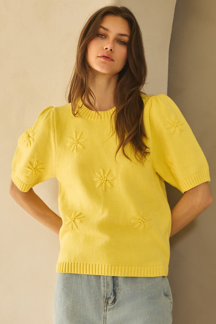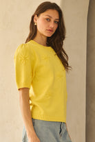 Knitted short sleeve sweater with flower details Content: 60% Cotton, 40% Acrylic