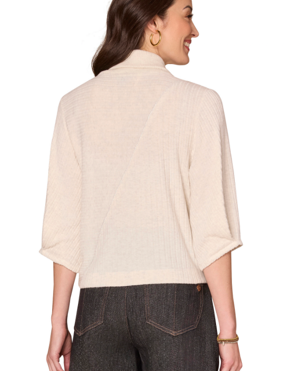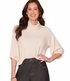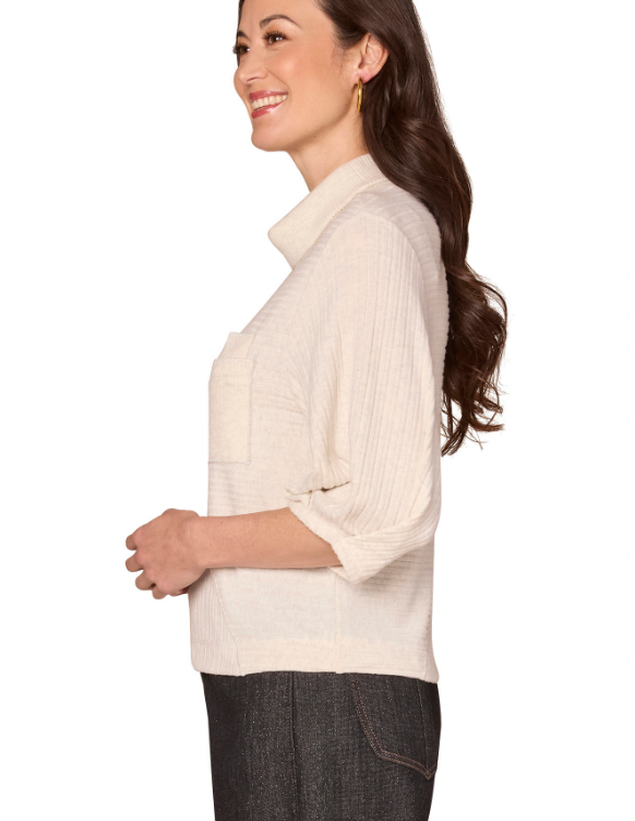 PLEATED ELBOW SLEEVE MOCK NECK KNIT TOP W/ LUREX SEAMING AND POCKET