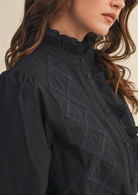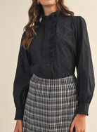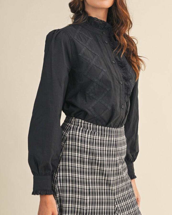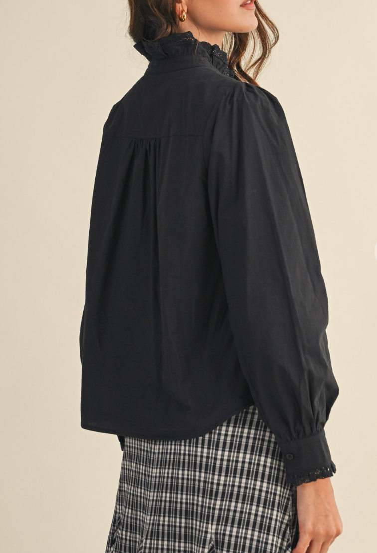 + Ruffled lace trim button down top + High ruffled lace trim neckline + Ruffled lace trim on button placket + Lace trim and pin tuck detail on front bodice + Long puff sleeves + Buttoned cuffs with ruffled lace trim + Relaxed fit + Lined