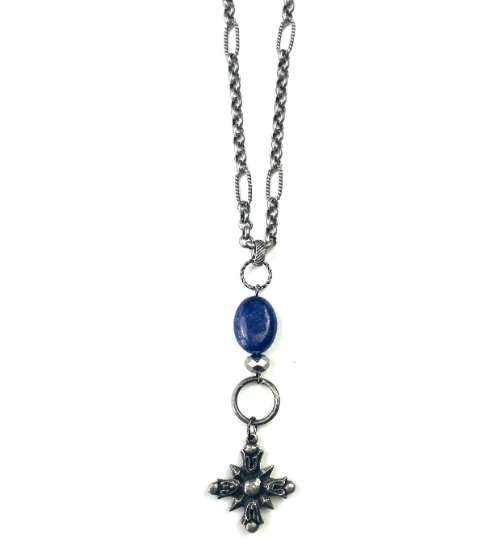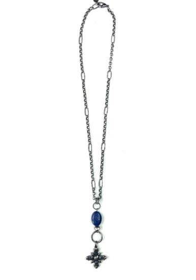 Short Chain Necklace w/ Blue Bead & Antique Cross Pendant