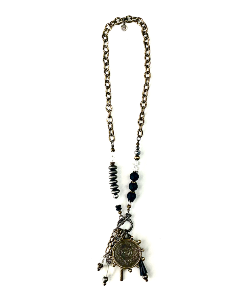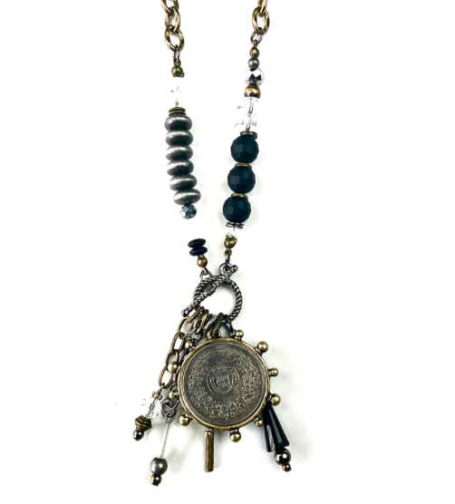 Toggle Asymmetric Beaded Necklace w/ Dangle Beads & Antique Coin