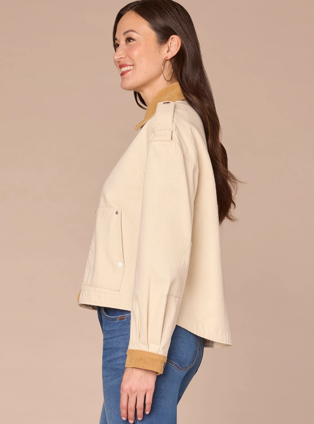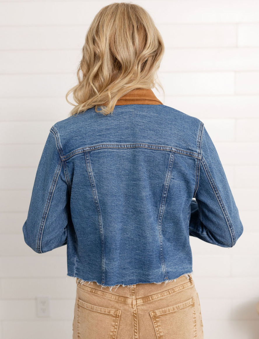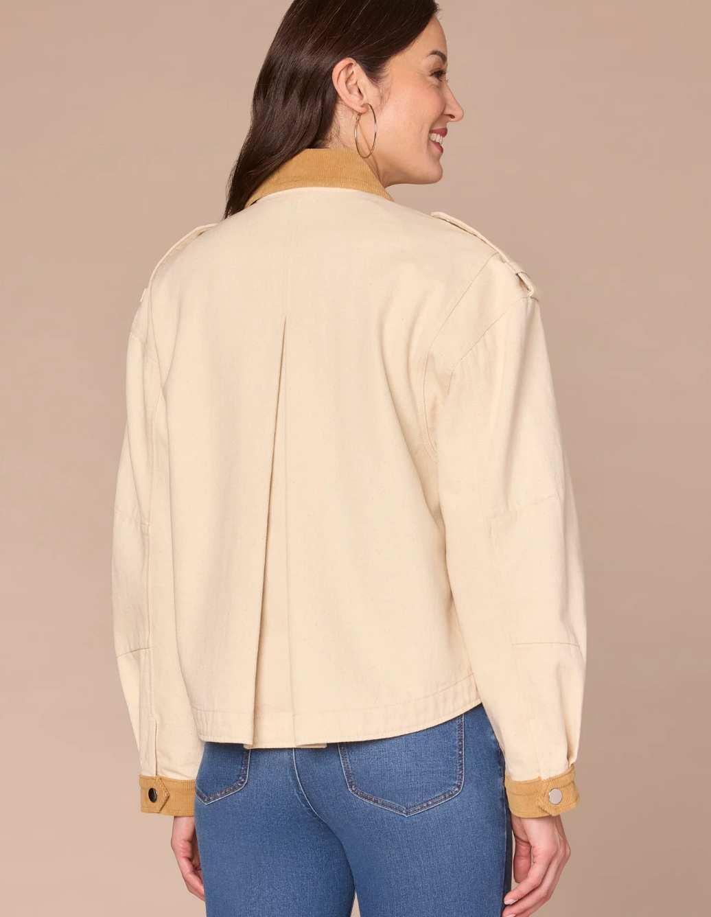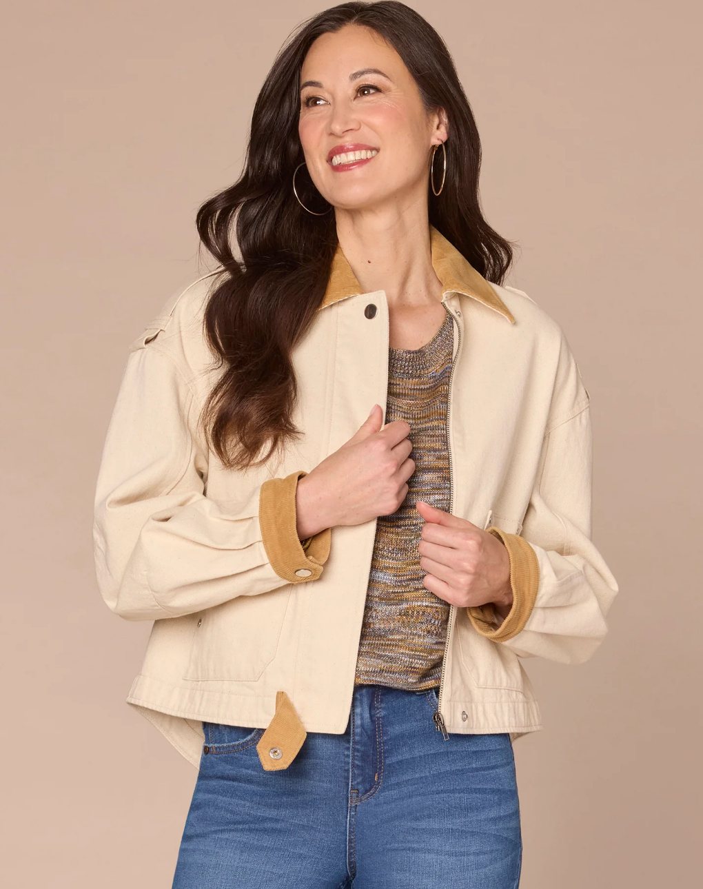 Long Sleeve Corduroy Contrast Denim Jacket with Hidden Zip Front