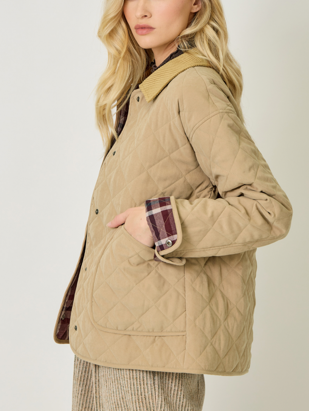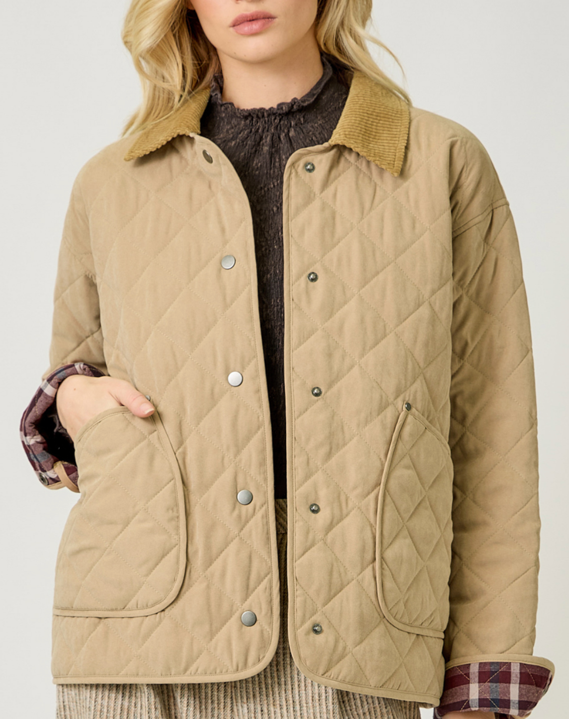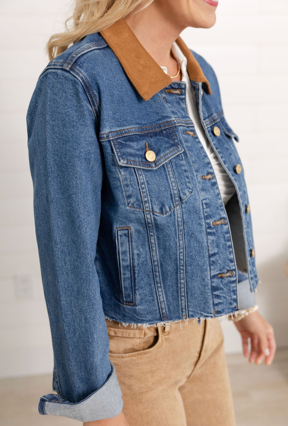 Long Sleeve Corduroy Contrast Denim Jacket with Hidden Zip Front
