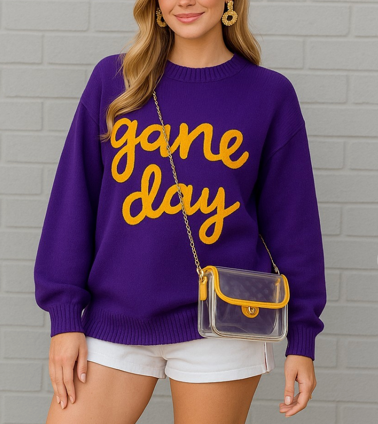 Get ready for tailgate season with our Gameday Light Weight Football Sweater! This cozy pullover, made from lightweight fabric, keeps you comfortable all day long. The playful cursive "Game Day" script adds a spirited flair, perfect for cheering on your team at the stadium or hanging out at home. Show off your team spirit with style and ease in this fun, game-day essential.