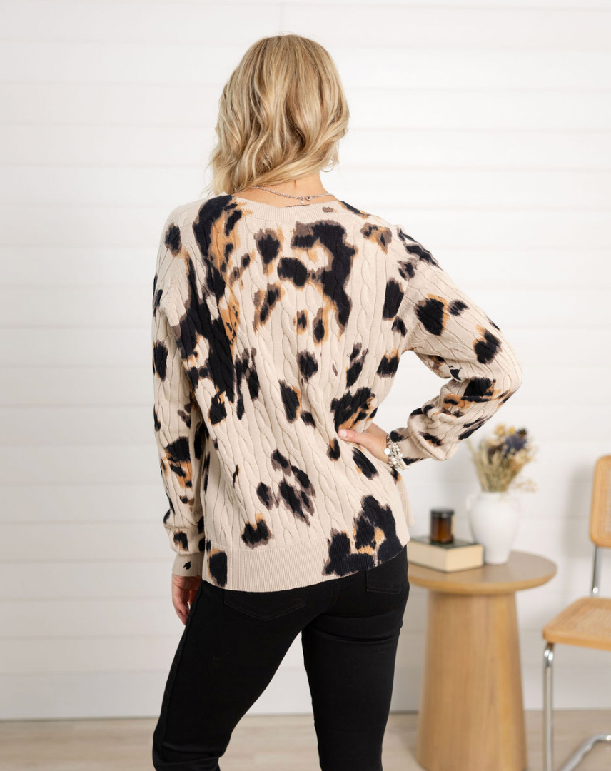 Elevate your wardrobe with this Animal Print Long Sleeve Crew Neck Sweater, featuring a refined cable knit texture that adds depth and elegance. The animal print is thoughtfully reimagined, offering a fresh and sophisticated twist on a timeless pattern. Its crew neck and long sleeves provide classic comfort, making it perfect for polished everyday wear or layered looks.