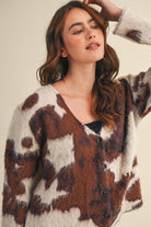 + Loose Fit + V neckline with button-down placket + All-over abstract cow print knit design + Drop shoulder long sleeves + Waist length cardigan