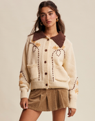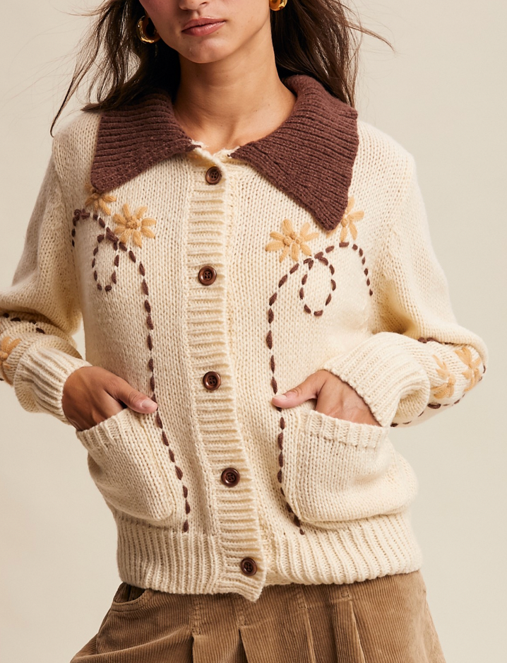 - Cozy Knit Fabric: Crafted from a soft, chunky knit for warmth and comfort - Contrast Collar: Oversized ribbed collar in a contrasting tone for a standout finish - Floral Embroidery: Delicate flower embroidery with stitched swirl detailing across the front and sleeves - Button Front: Easy closure with wooden-style buttons for a rustic touch - Functional Pockets: Patch pockets at the front for practicality and charm - Relaxed Fit: Slightly loose silhouette with ribbed hem and cuffs for cozy layering Blending boho romance with Western-inspired charm, this cardigan pairs effortlessly with denim shorts, a midi dress, or layered over lace for a playful contrast. Its embroidery and textured collar bring a vintage-meets-modern feel, making it a statement knit for casual days or styled-up nights.