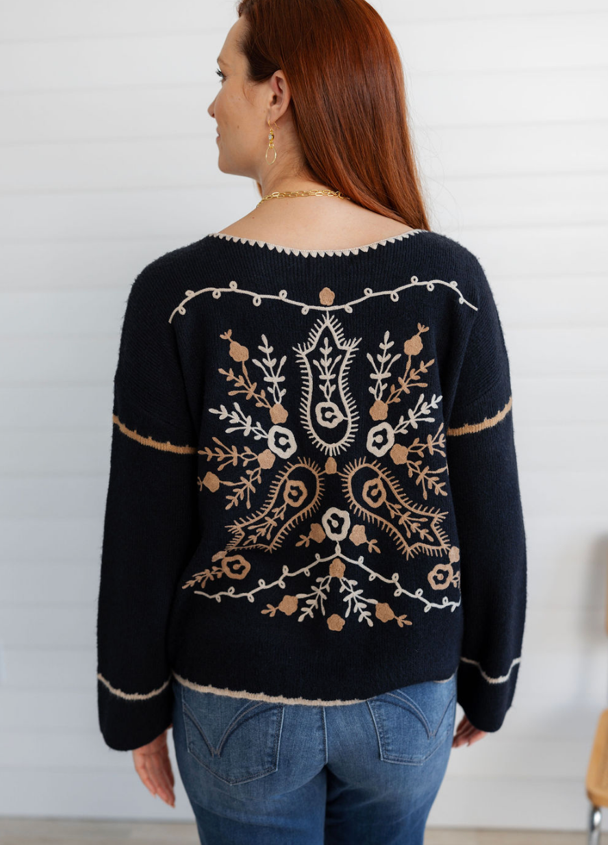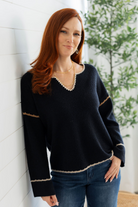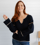Ribbed V-Neck Notched Soutache Sweater