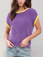 Stay effortlessly cool in this breezy knit top featuring rolled sleeves and a contrast trim neckline and cuffs. Its relaxed fit and lightweight texture make it a versatile piece for everyday comfort-perfect for layering, lounging, or cheering on your team in style. The open knit weave offers breathable ease, making it a go-to pick for warm weather or spirited gameday fun.knit top, rolled sleeve top, contrast trim top, gameday outfit, gameday top, casual sweater, lightweight knitwear, relaxed fit top, summer knit top, sleeveless sweater, tailgate fashion, spirited style, comfy top, breathable knit, weekend wear, football season style, stadium outfit, sporty chic