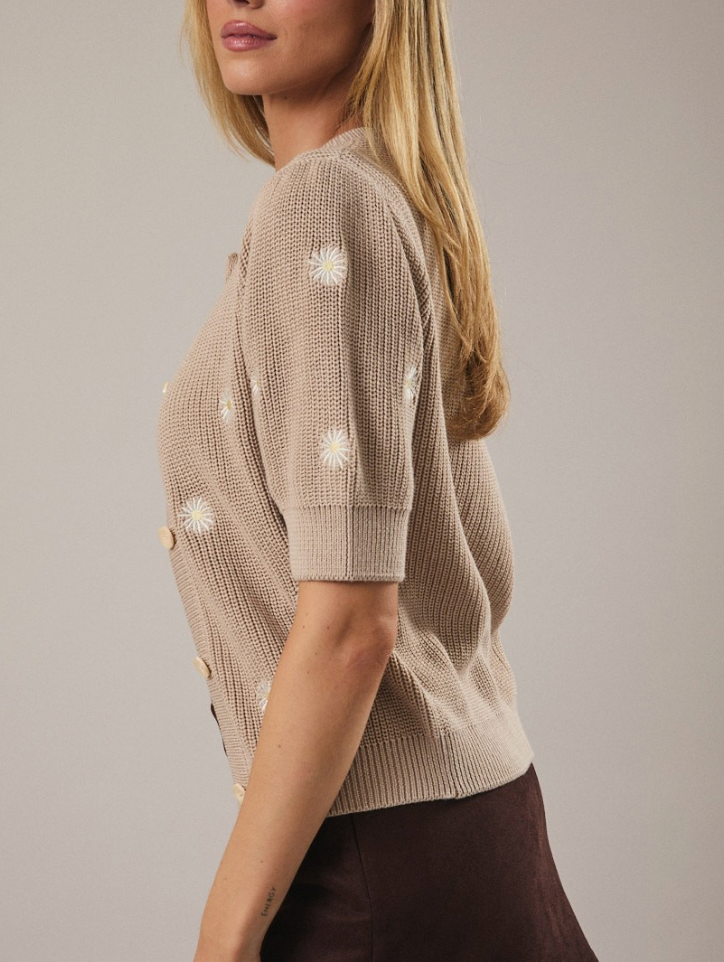 Puff Sleeve Button Down Daisy Embroidered Sweater Top