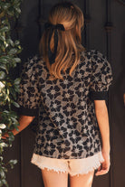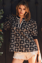 Embroidered top w/ contrast-trim split neckline & short puff sleeves