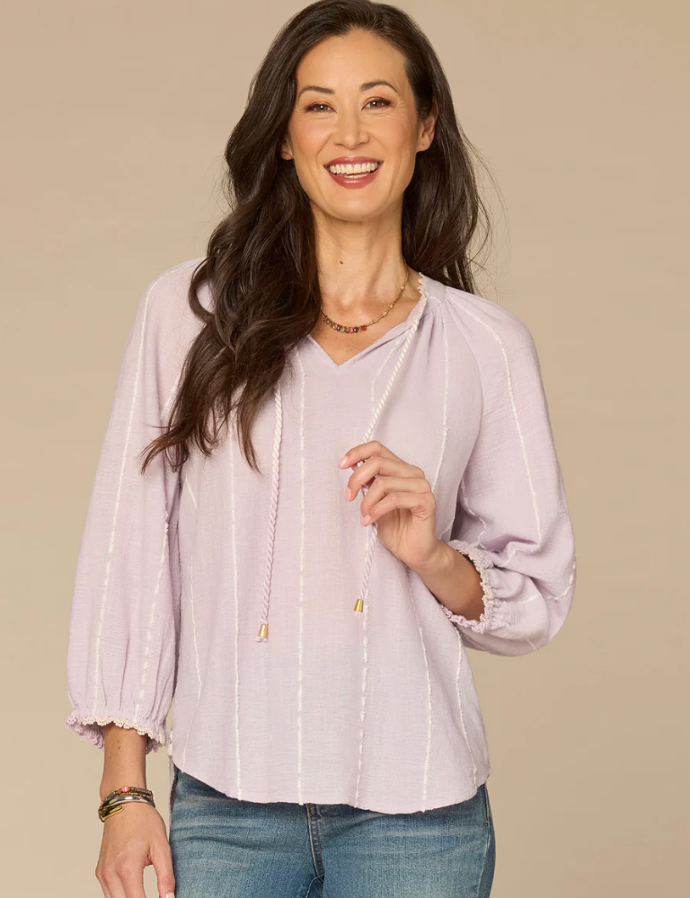 Classic, cool, and full of feminine detailing, this woven top is about to become your new favorite go-to. It brings boho vibes with three quarter blouson sleeves, a split neck with a braided tie, and vertical embroidered stripes.