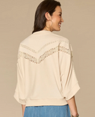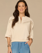 Neutral staples will always have a place in your wardrobe, like this knit top. Its three quarter dolman sleeves, embroidered mandarin collar, half V-placket, and crochet detailing make it easy to wear with everything in your closet.