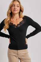 This stylish and form-fitting long-sleeved features an elegant V-neckline beautifully accented with a delicate lace trim, enhancing its sophisticated appeal, and is crafted from a comfortable ribbed knit fabric that subtly contours the body.