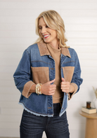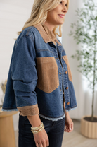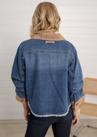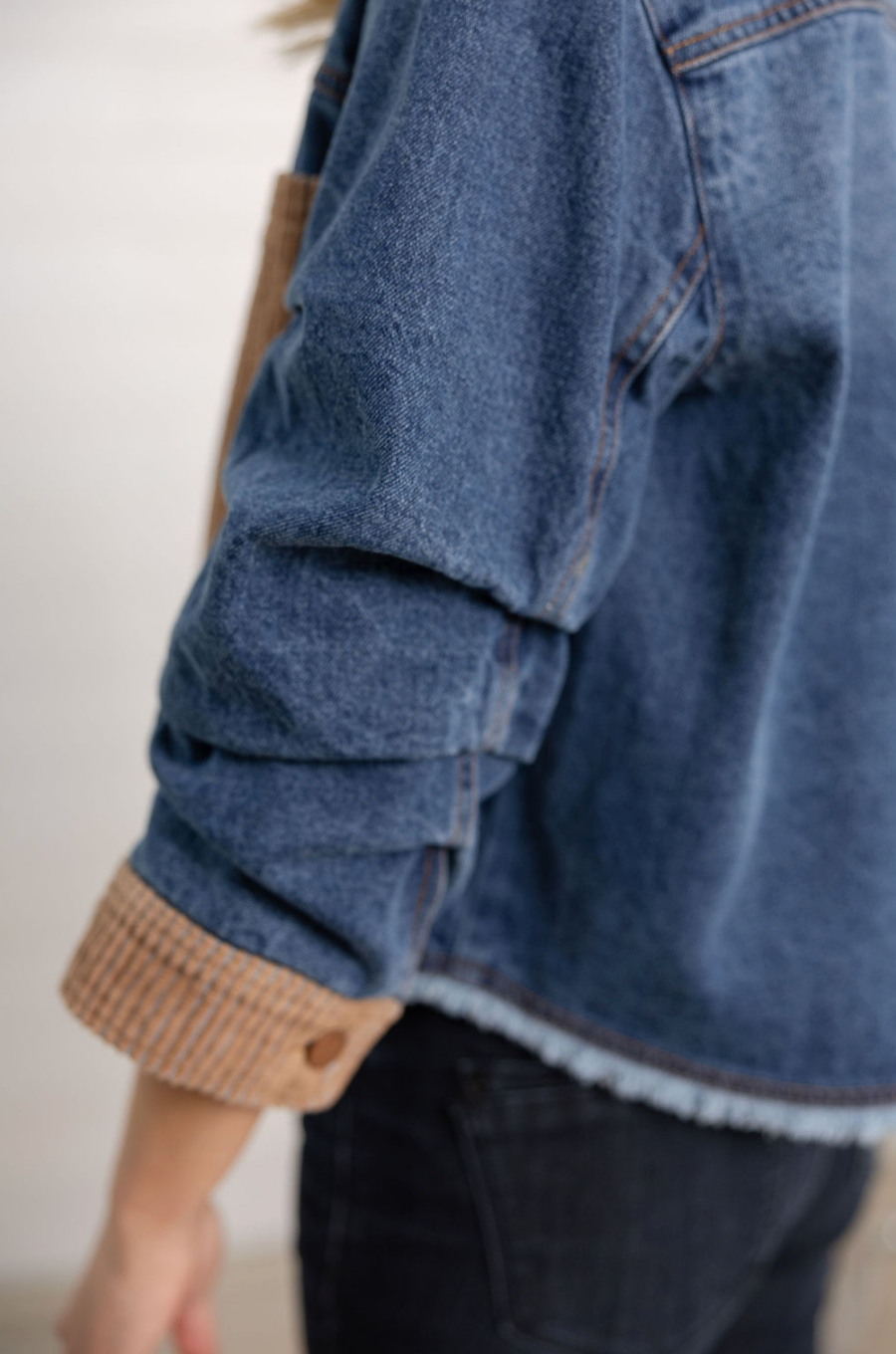 This 3/4 ruched sleeve denim jacket combines classic denim with warm corduroy accents on the front pockets and collar, adding texture and visual interest. The rounded fray hem gives it a relaxed, modern edge, while the ruched sleeves enhance fit and comfort. Perfect for layering, this jacket offers both style and versatility for a sophisticated casual look.