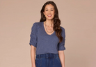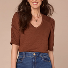 Featuring elbow ruched puff sleeves, a scallop V-neck, pintucks and embroidered details, and a surplus shirttail hem, this knit top is a wardrobe essential.•