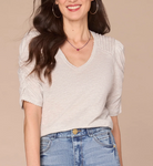 Elbow Puiff Sleeve V-Neck Knit Top w/ Pintucks &Crochet