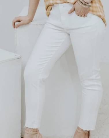 If there’s one guarantee for spring and summer, it’s that a woman needs her white denim. The raw hem and minimal destruction a subtle edge, and is ready to go with any and all of your warmer-weather fashion. Complete with our famous stretch waistband technology, you will feel supported, held in, lifted up, and like you're wearing leggings!