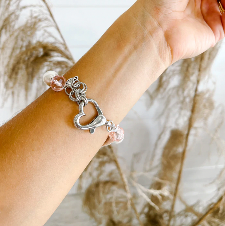 Mac & Me White Pearl w/ Pink Crystal Chanel Bracelet w/ Silver Platinum Clasp & Extender Chain w/ Sig Stone